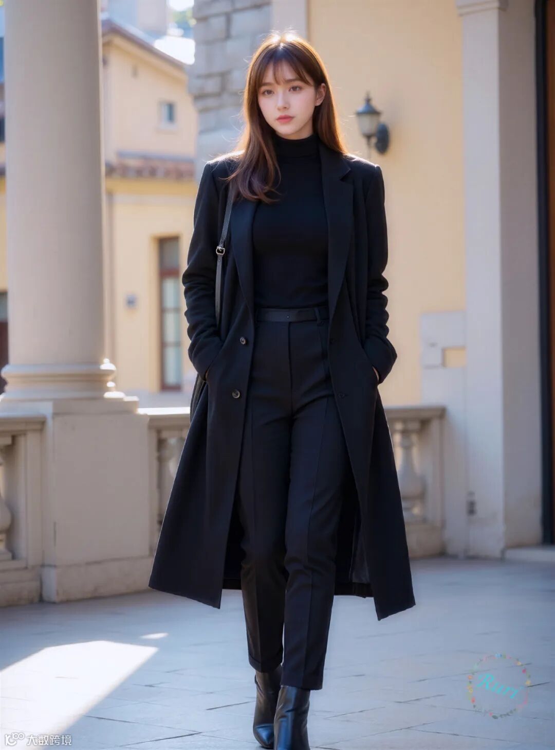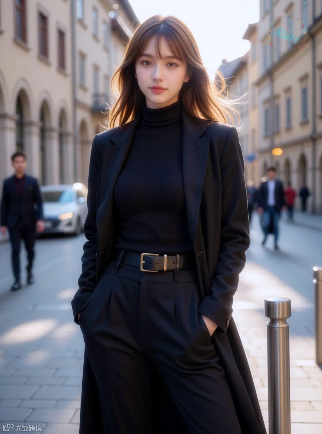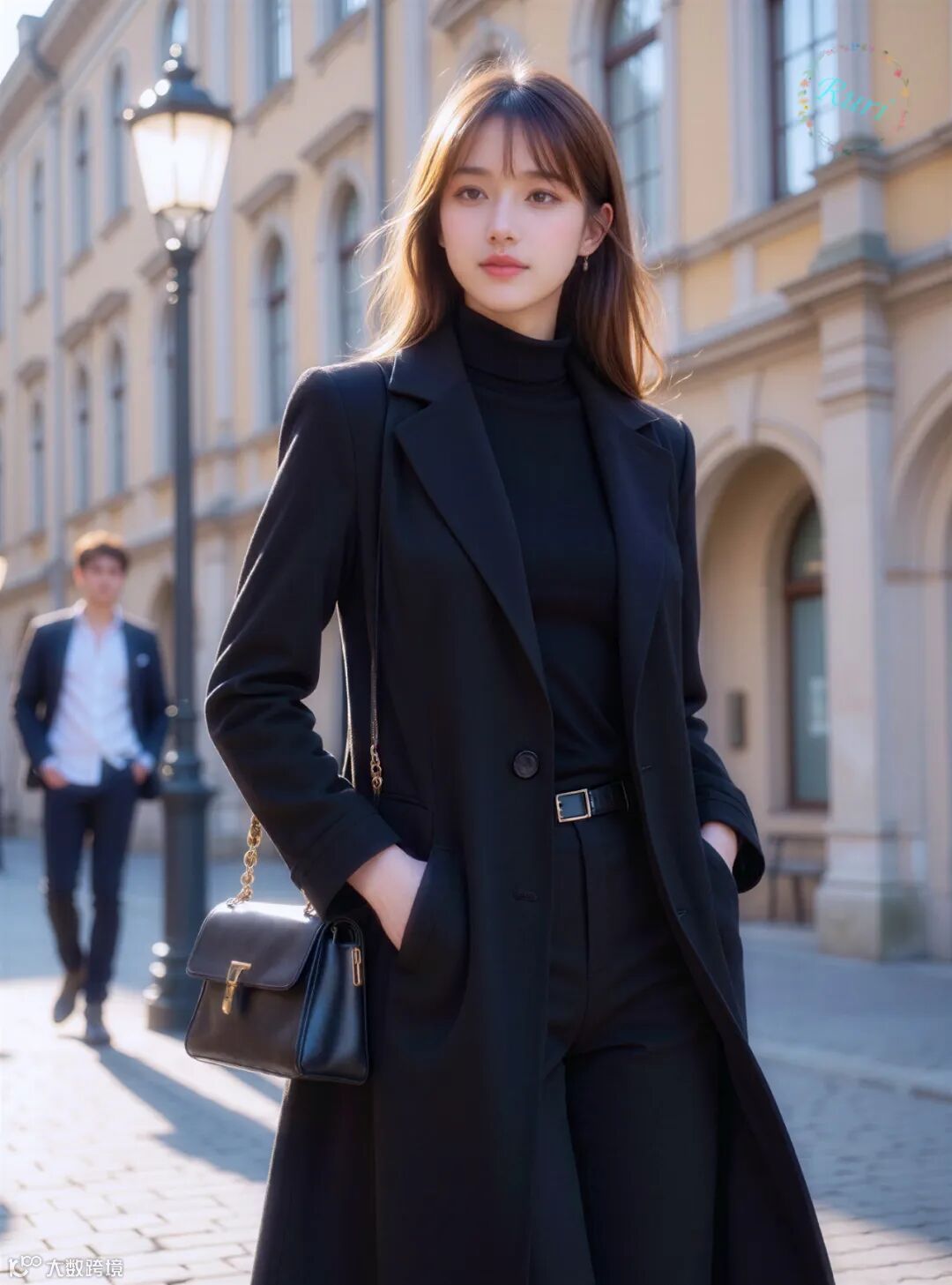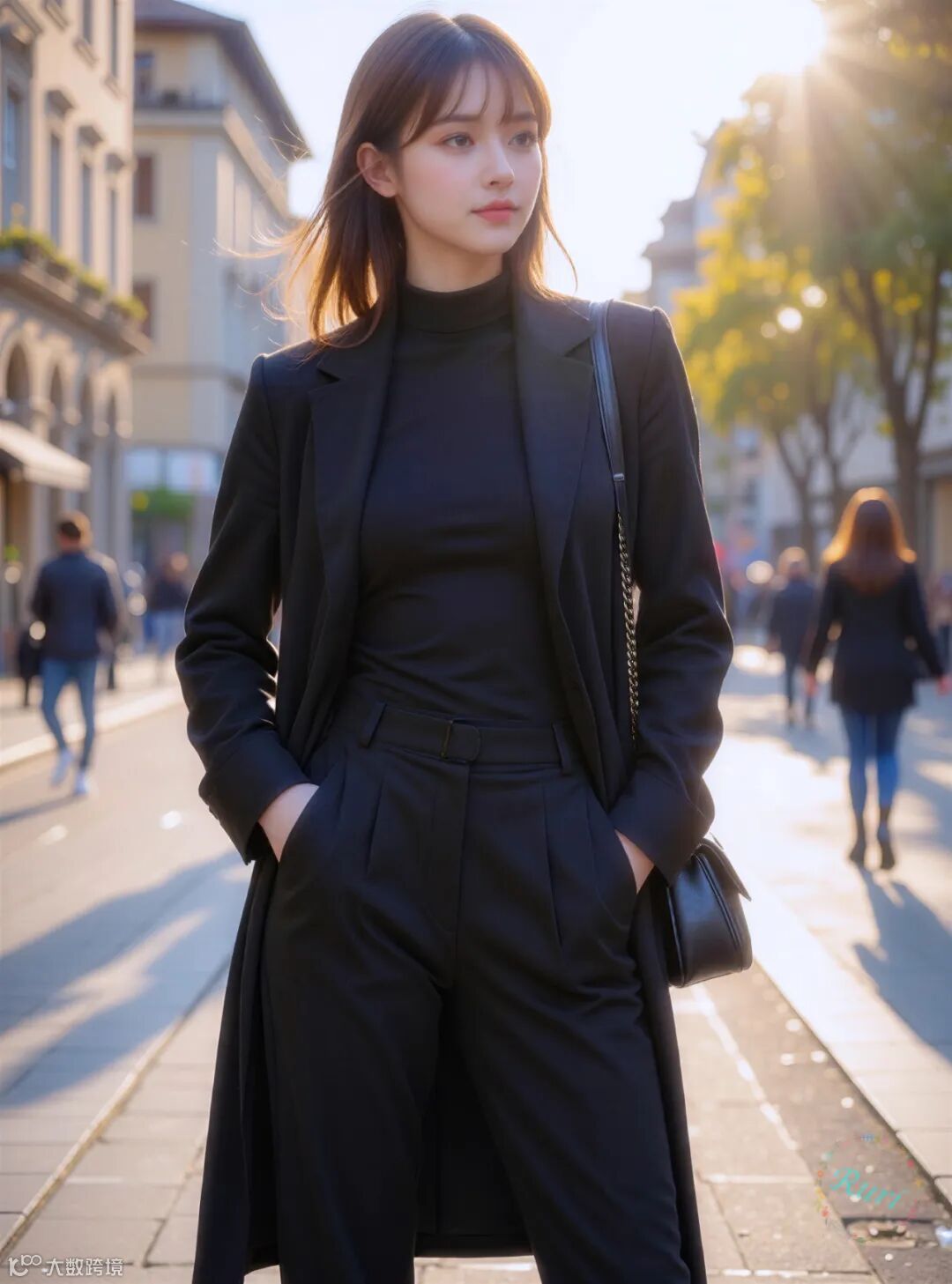 金色的阳光洒在历史感的欧式街道上,为深沉的黑色造型增添了温暖的轮廓光,形成了强烈的对比。人物被镀上了一层金边,让黑色更显高级质感,也烘托出一种“电影感”的氛围。背景中的行人与建筑作为虚化的衬托,让焦点牢牢锁定在主体身上。这种对比和衬托,使得画面既有深度,又充满了故事性,完美地将都市的忙碌与个人的沉静优雅对立统一,呈现出一种高级而耐人寻味的时尚美学。