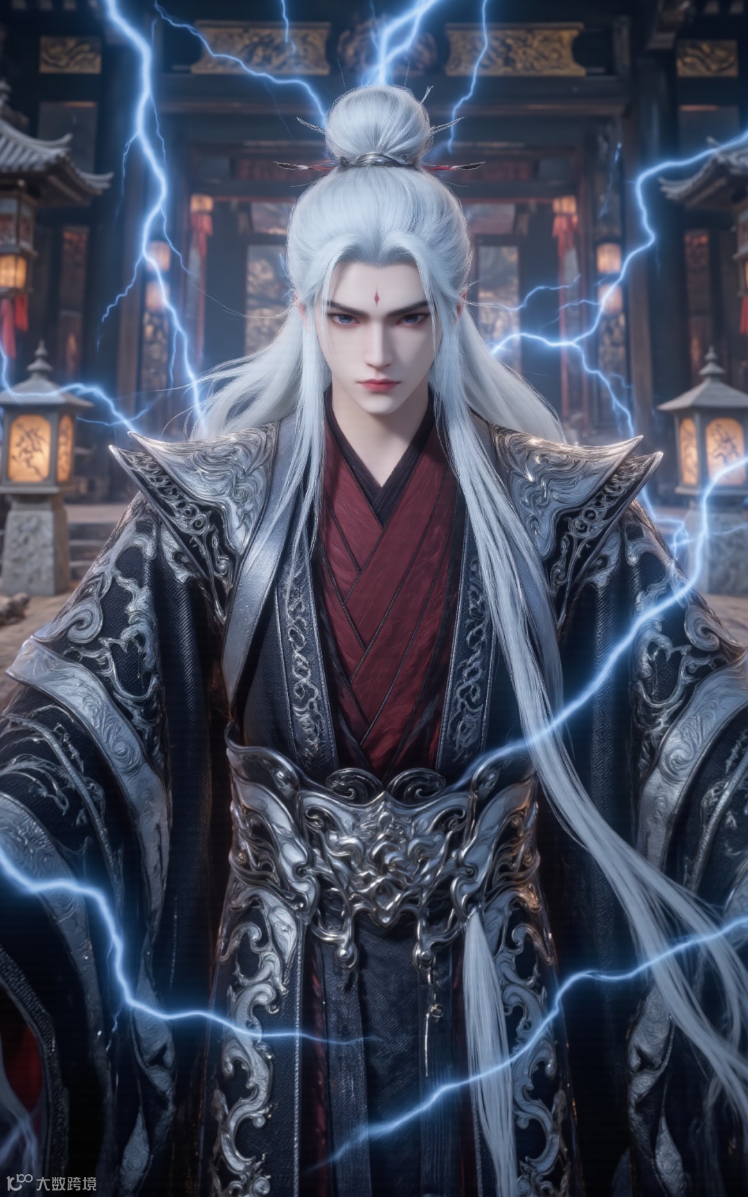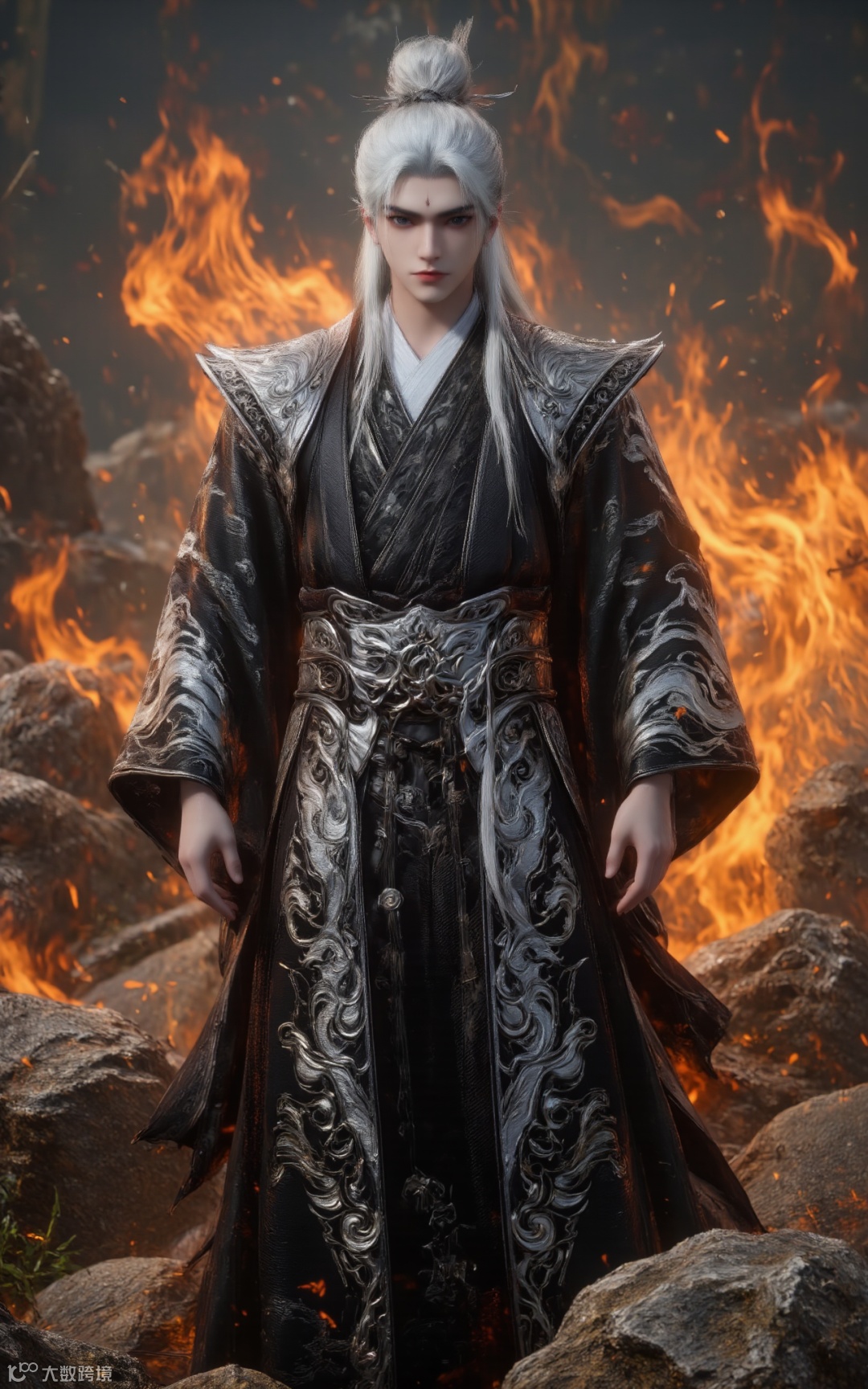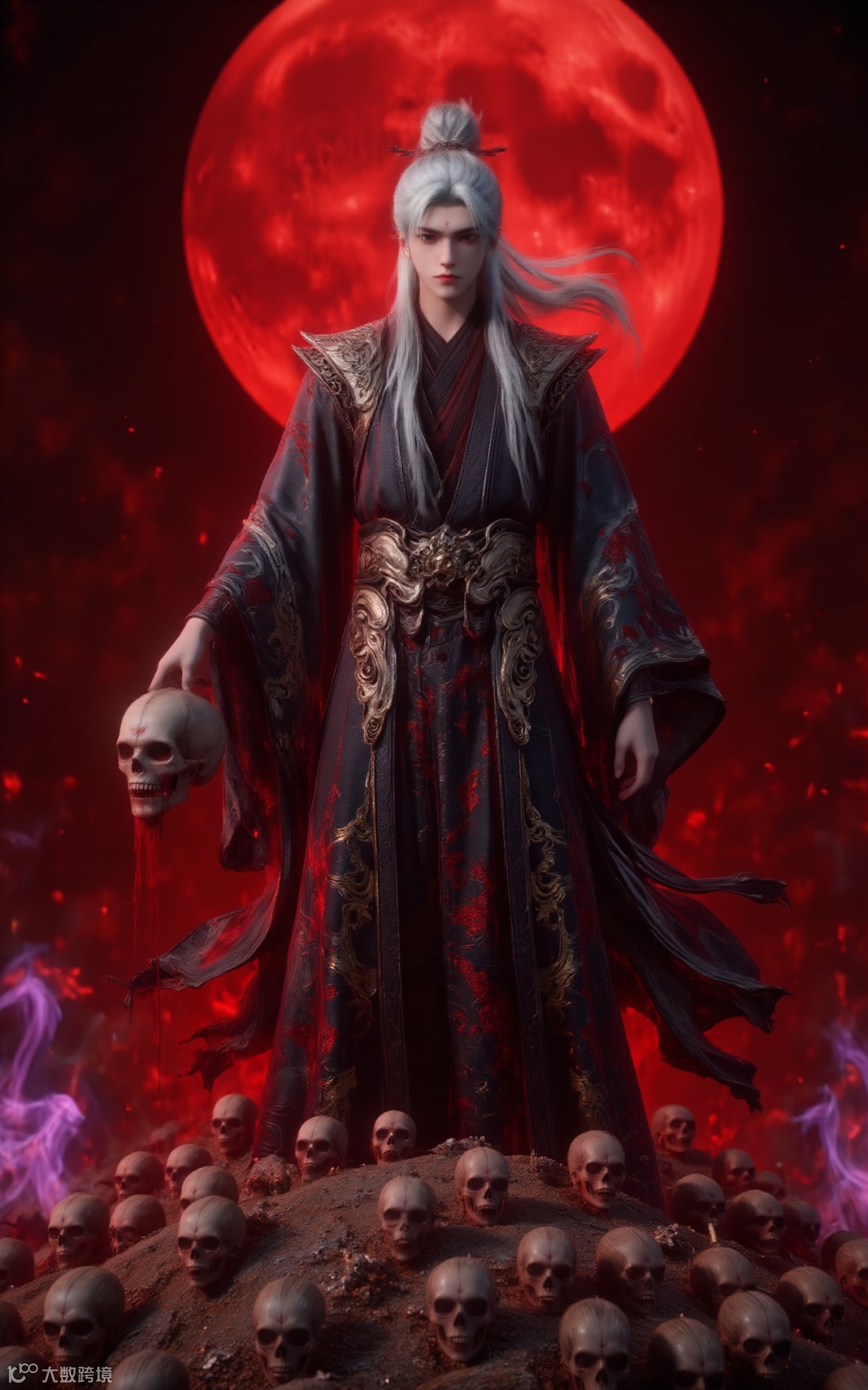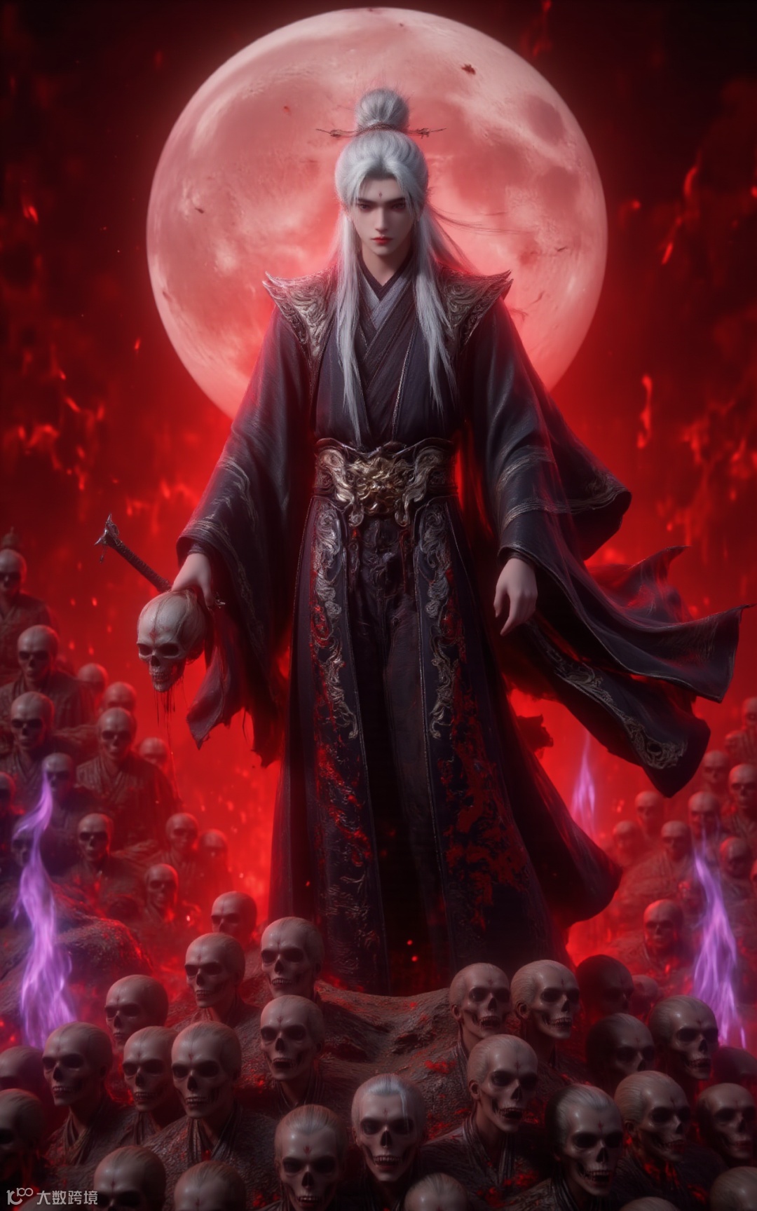This is a dark fantasy art style digital illustration of a tall and powerful character with long flowing silver hair. The main character of the picture is Wang Lin, dressed in a long black traditional Chinese kimono with intricate dark red and gold patterns. His piercing eyes are clearly visible, giving him a sense of majesty. He stood on a hill made up of countless skeletons piled up on top of each other, and in his left hand he carried a blood-stained skull with crimson liquid dripping from it. The background is a bright, intense red, with a large full moon giving off an eerie glow. Countless skeletons surrounded the figure, adding to the gloomy and terrifying atmosphere. The ground is strewn with bones and blood, adding to the eerie atmosphere. The overall colour palette is dominated by deep red and black.A pile of skulls, completely engulfed in flames, inferno, blazing, concept art, masterpiece, perfect lighting, purple flames, 4k, absurdres, This illustration exudes an aura of horror and supernatural power, typical of the dark fantasy genre.