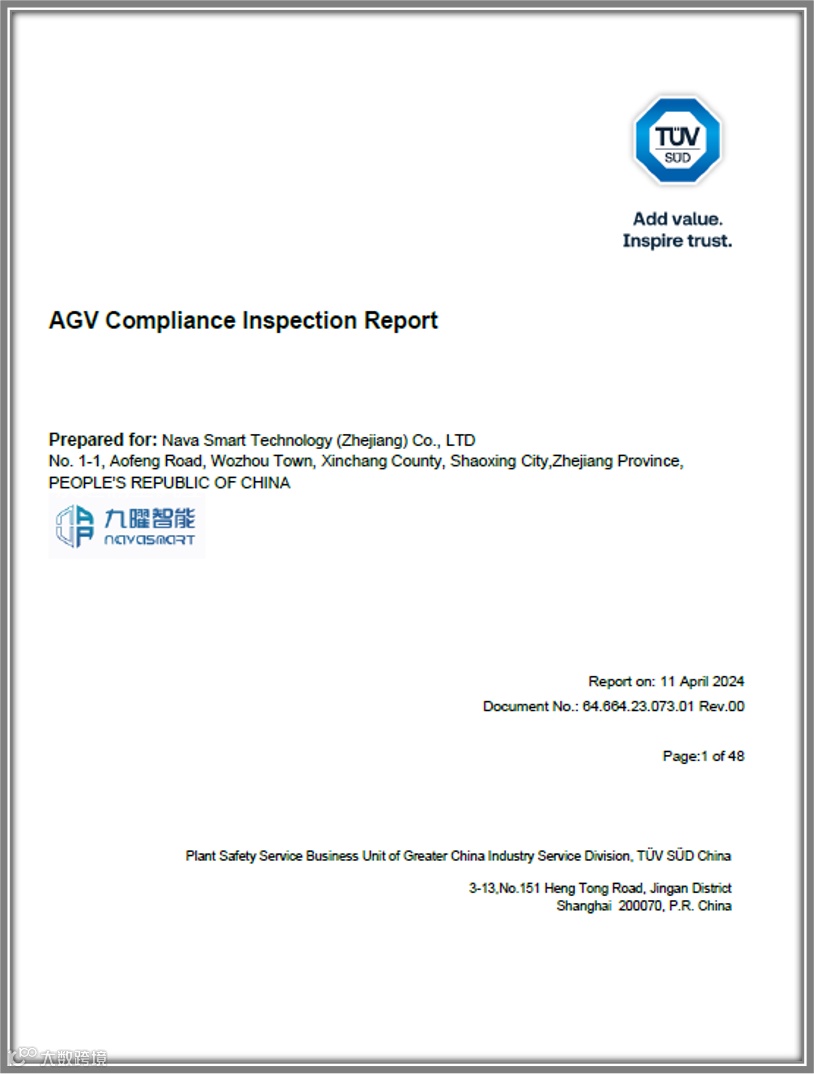 4月11日,国际知名第三方机构TÜV南德为九曜智能颁发《平衡重无人叉车PLd安全评估报告》,所有测试项目均一次性通过,安全指标达到甚至高于市场同类产品的安全要求,报告建议平衡重无人叉车投入实际业务运行。