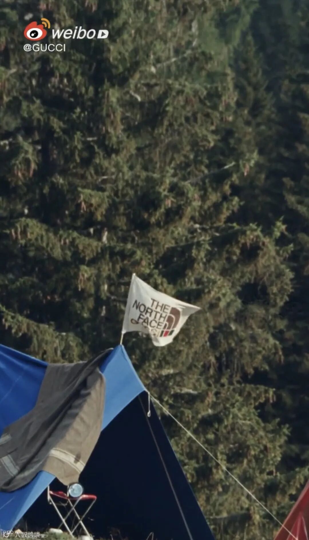 在Gucci官方放出的视频中能够看到印有Gucci与The North Face的logo旗帜。登山露营地,山峰与野外风光展露浓浓户外风。