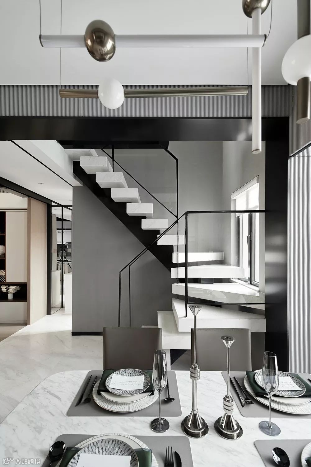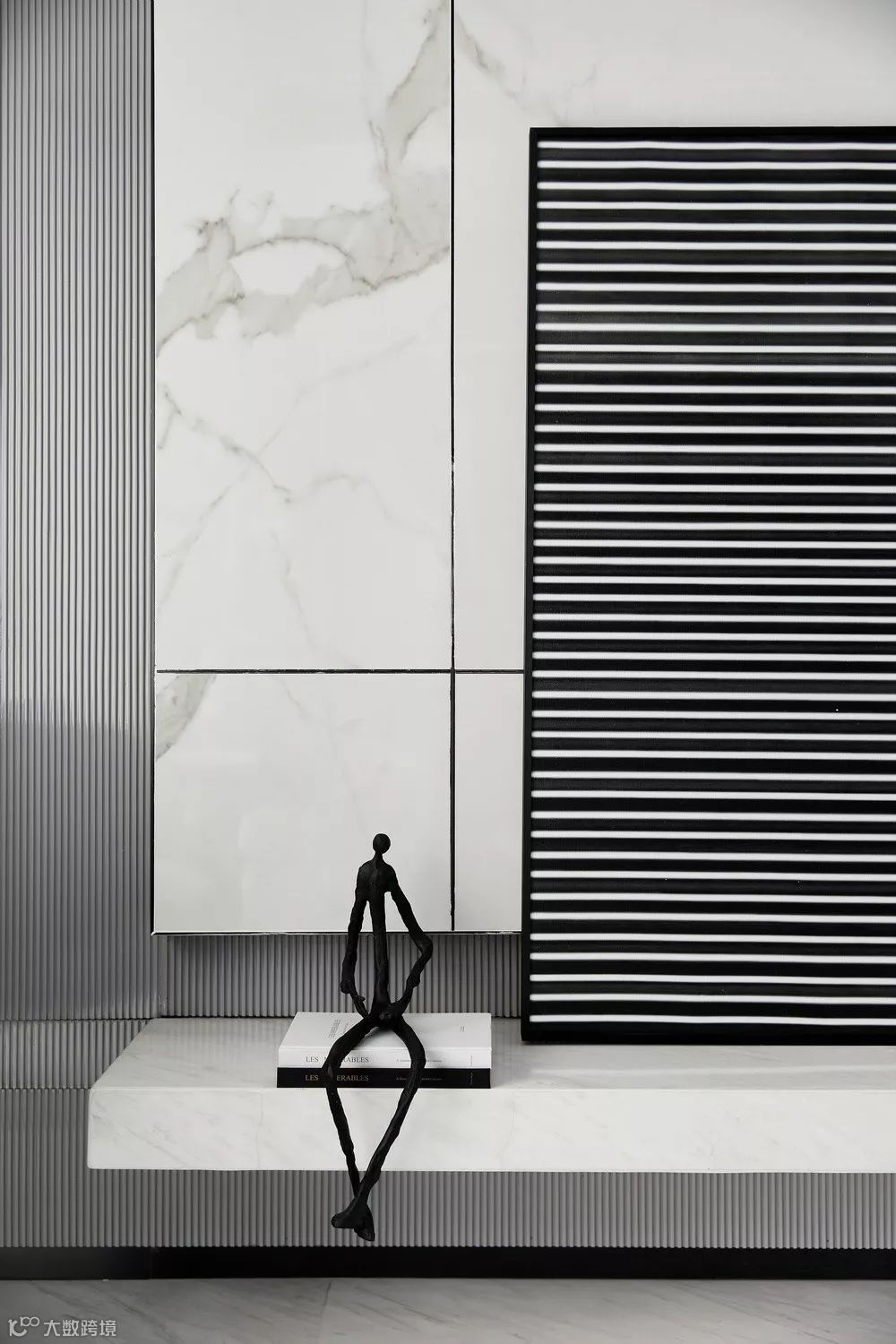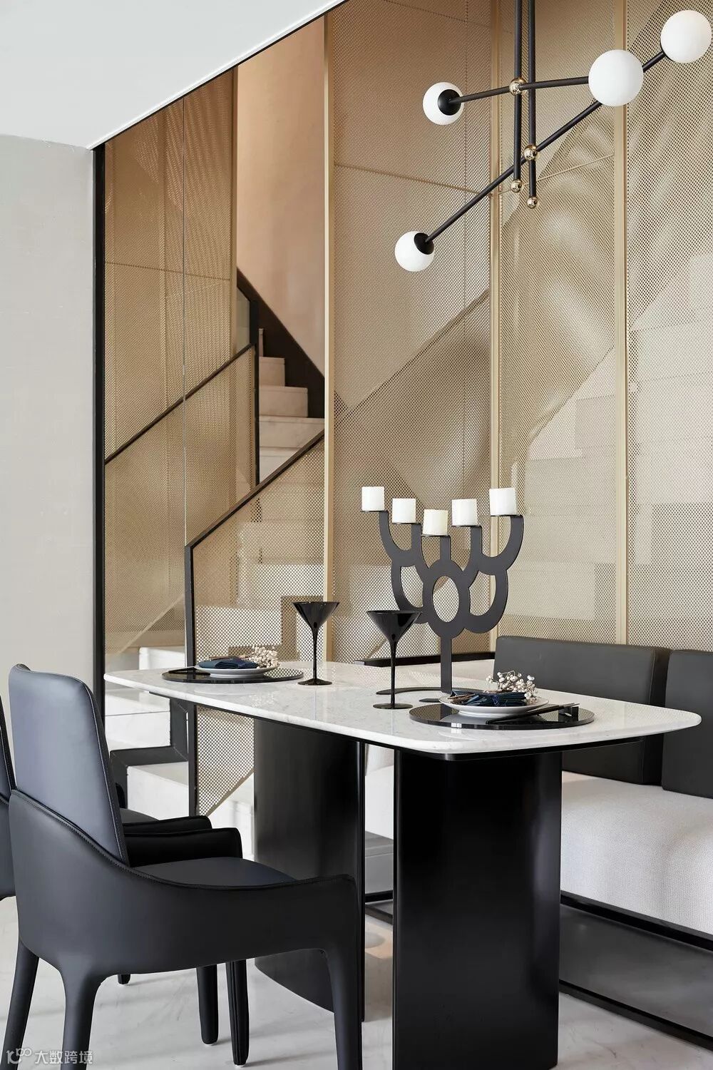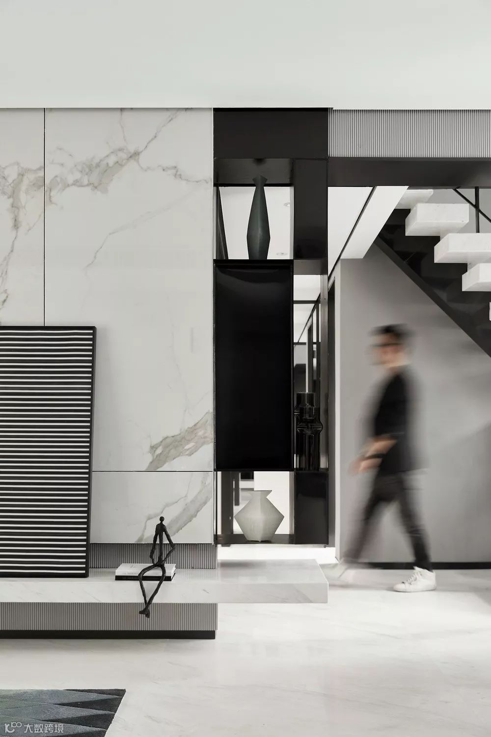 每一种材质都有着自己特有的肌理、色彩和节奏,之间潜藏的色调深度层次,让空间充满动态感。发挥结构构成本身的形式美,以黑白灰主导了一场思维的立体结构和多维度的空间概念。