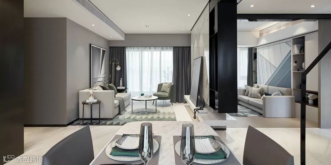 在这套100平米的开放式空间设计中,客厅、餐厅既保持互通相连,又体现出每个空间的独立性,把设计的空间变成在使用上更舒适的生活空间,串联人文、艺术的生活主线,塑造现代优雅的时光立面。
