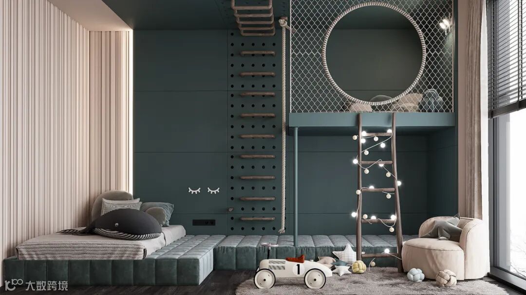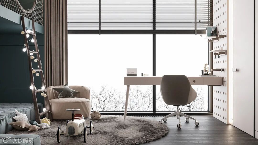 儿童房设计,是以墨蓝色加米色,设计师设计时添加了很多童趣元素,让孩子在自己的小空间能快乐的成长。