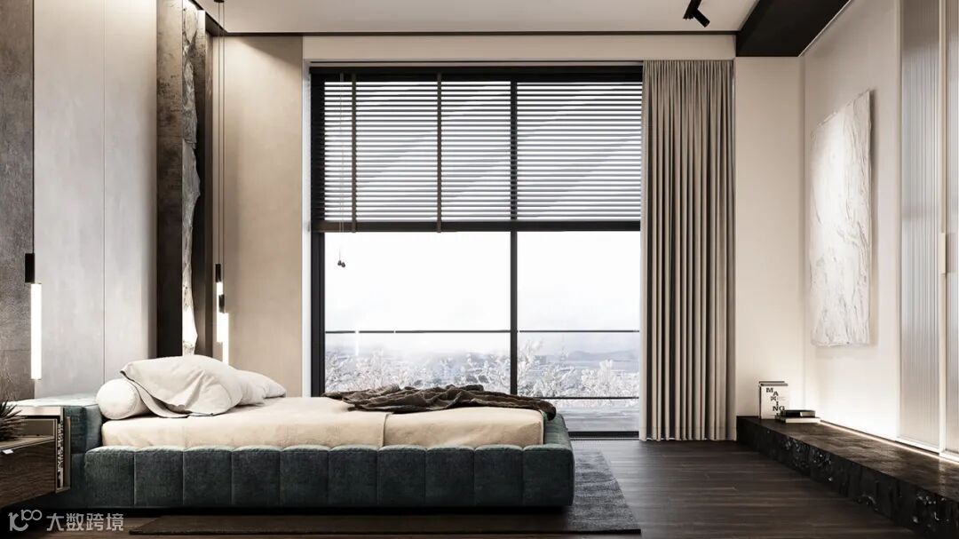 主卧以灰色加白色为主,落地窗设计让屋外的风景成了室内的一道风景线,也让空间更宽裕,大理石墙面上这个空间更加的高级。