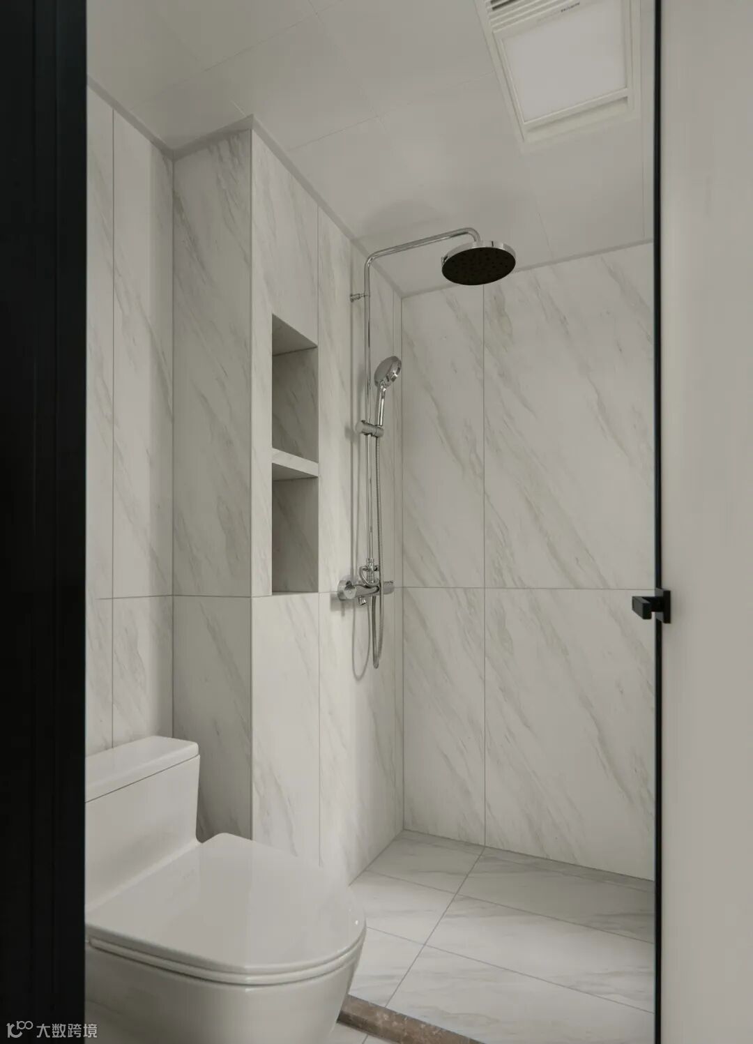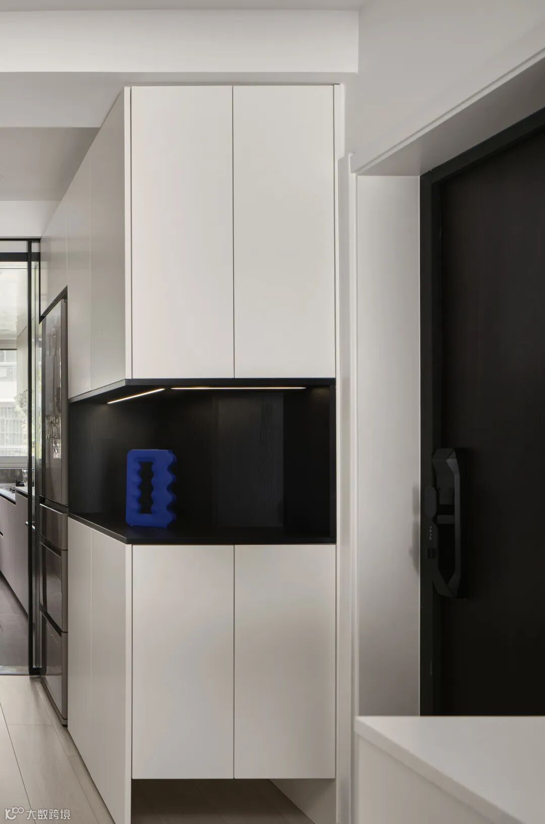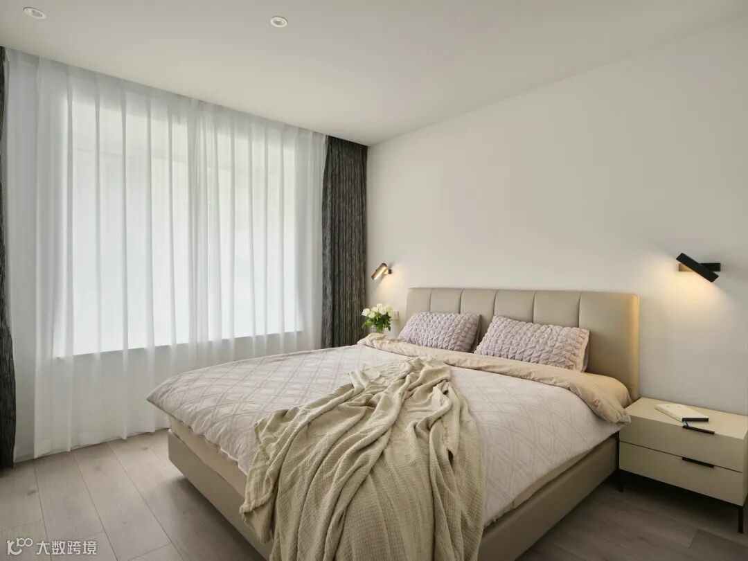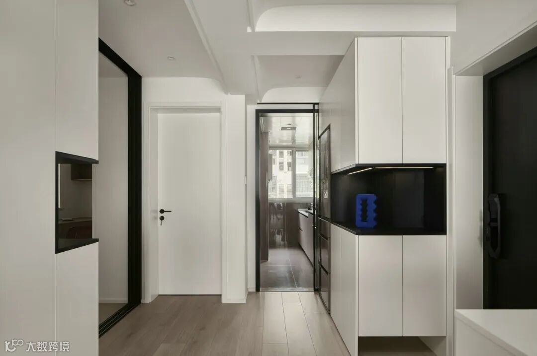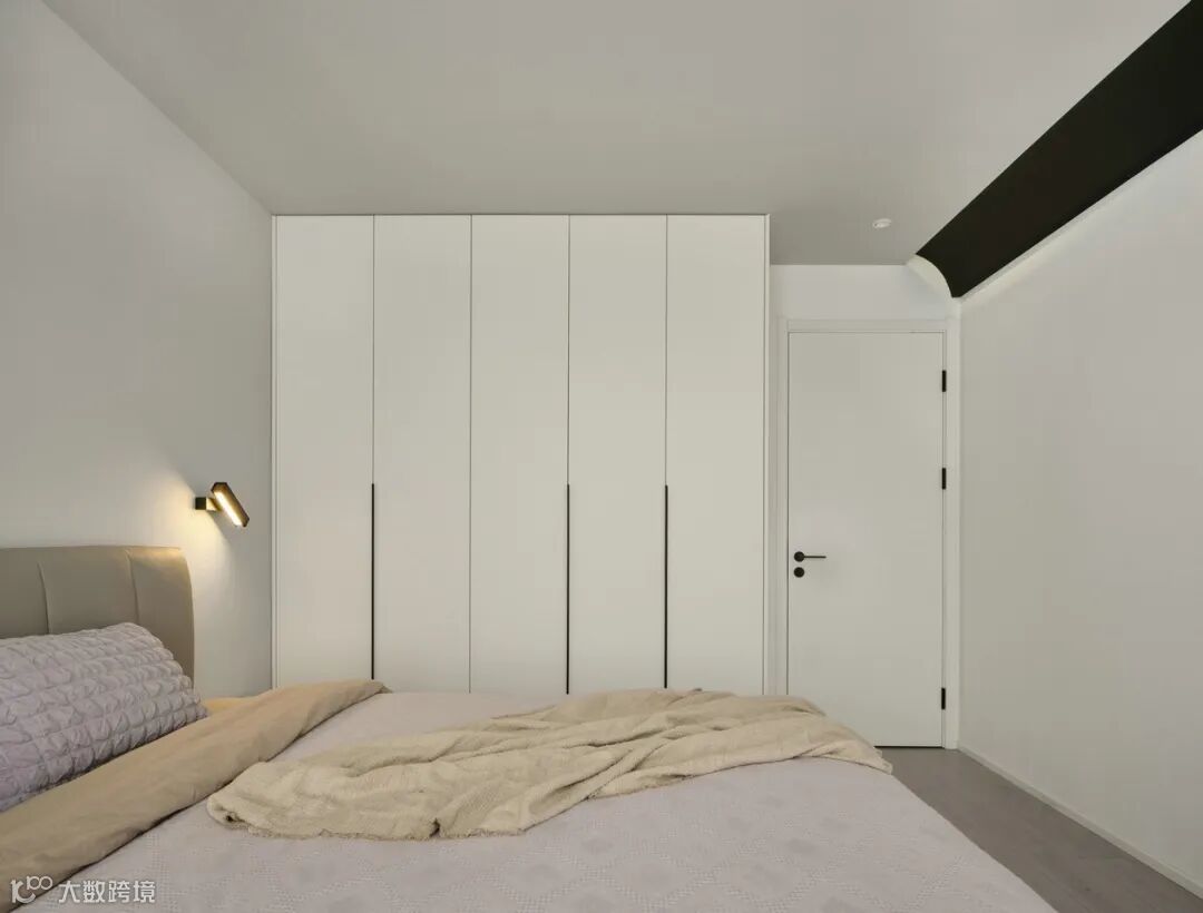 主卧整体黑白色调,墙面和柜面为白色,柜门把手、门把手还有顶部的黑色造型颜色呼应,另外顶部黑色造型实际是隐形造型,内含卫生间向阳台水管走向。