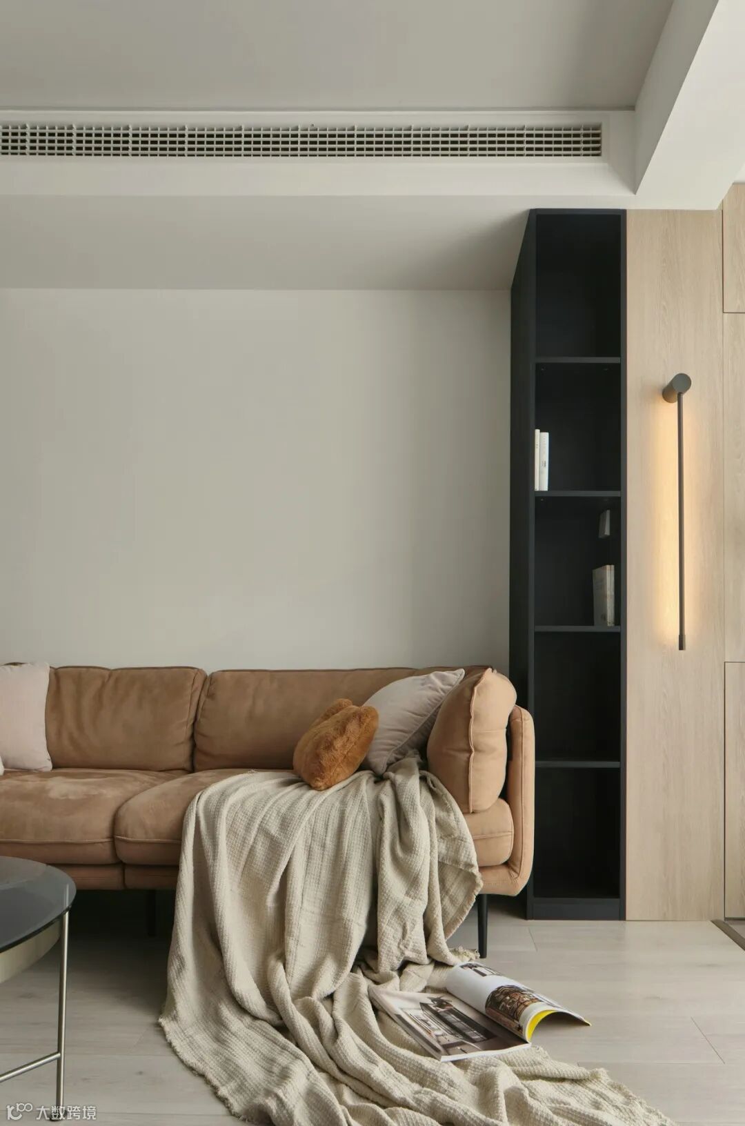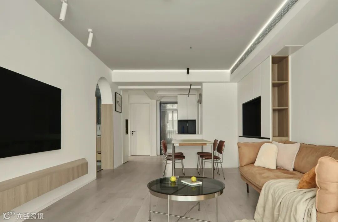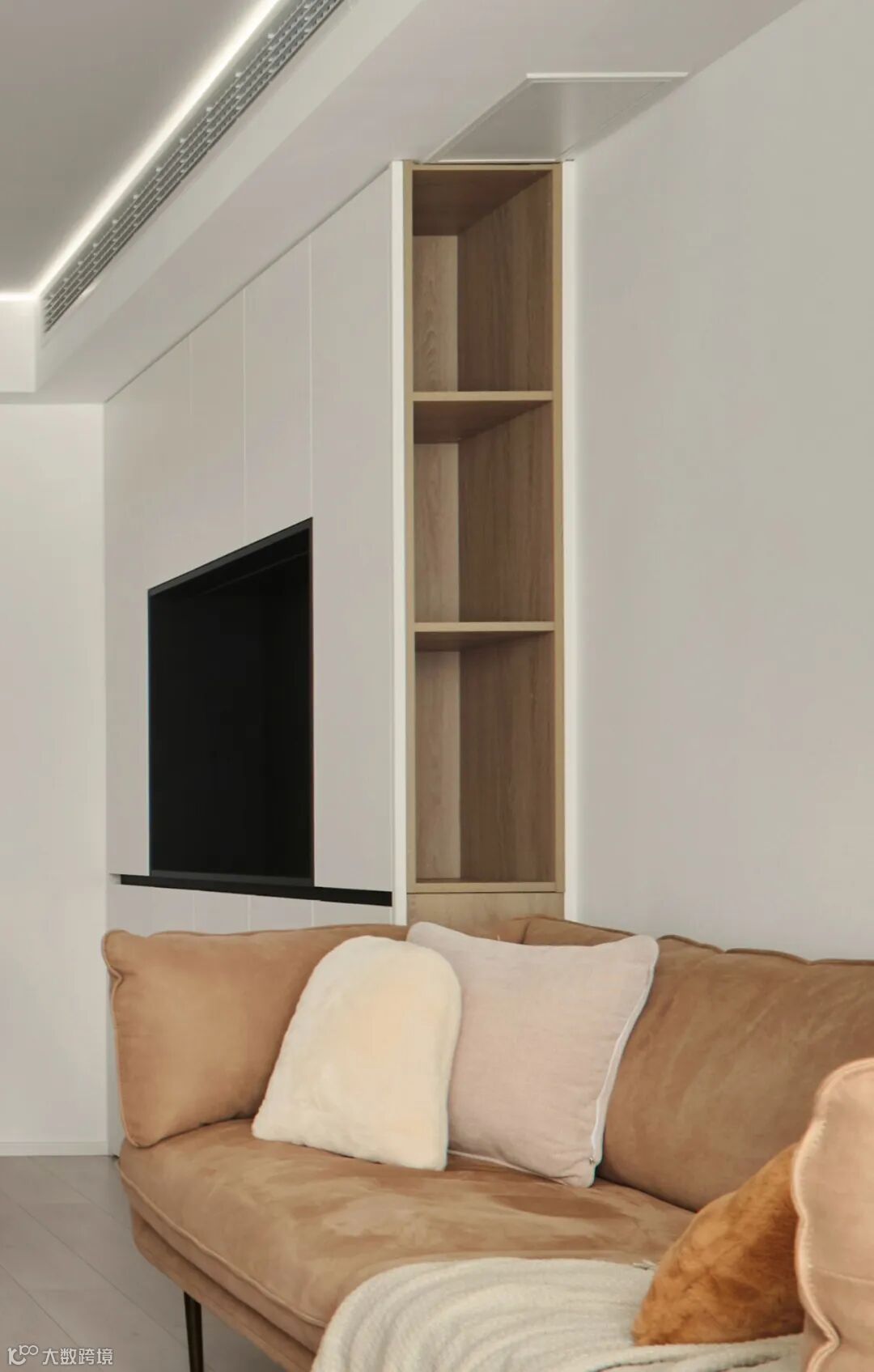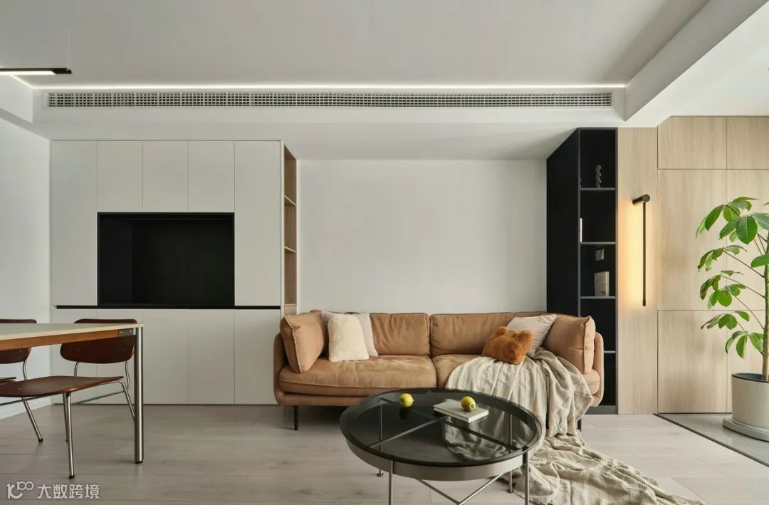 沙发侧边开放式柜体,方便就近拿取物品,在设计上营造露出显大的视觉感。