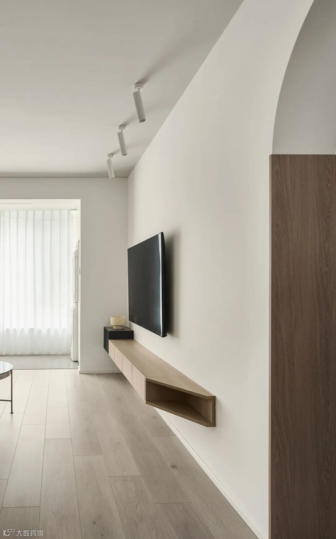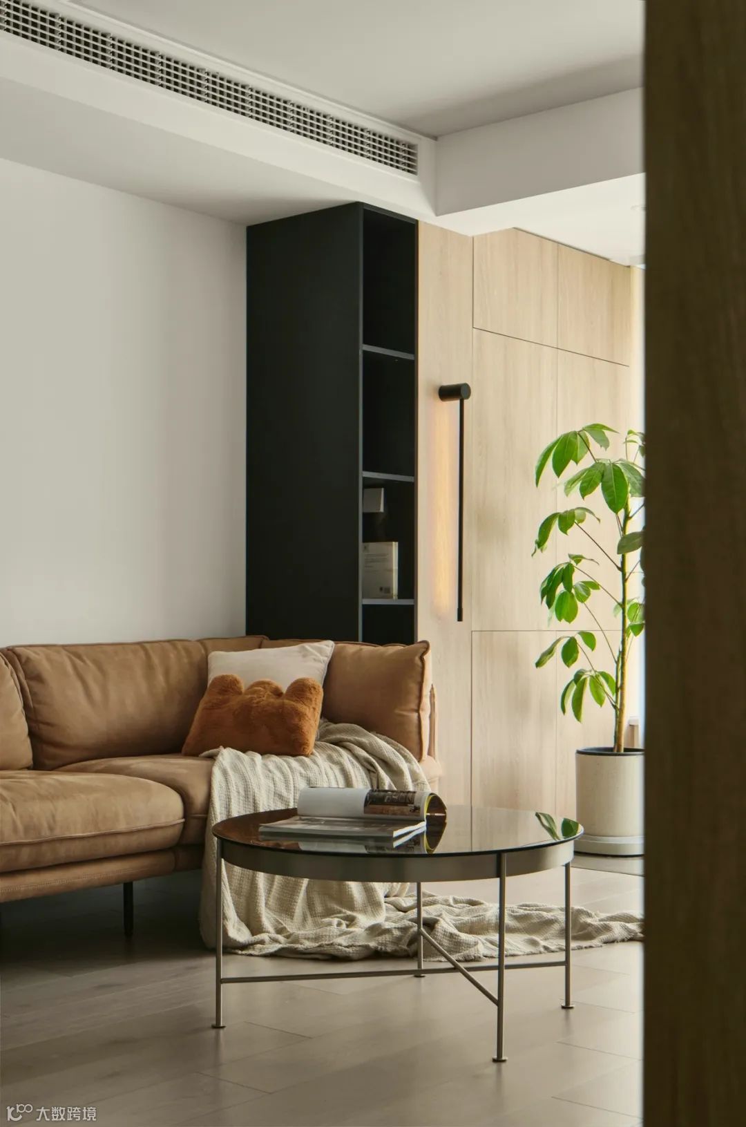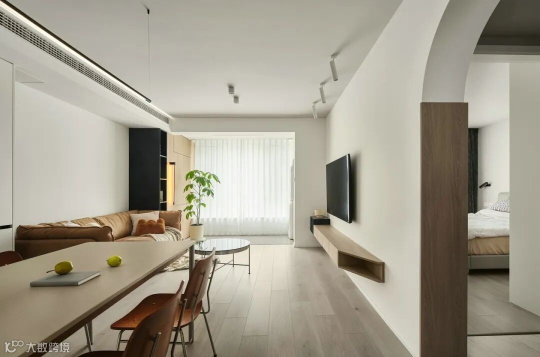沙发侧边开放式柜体,方便就近拿取物品,在设计上营造露出显大的视觉感。