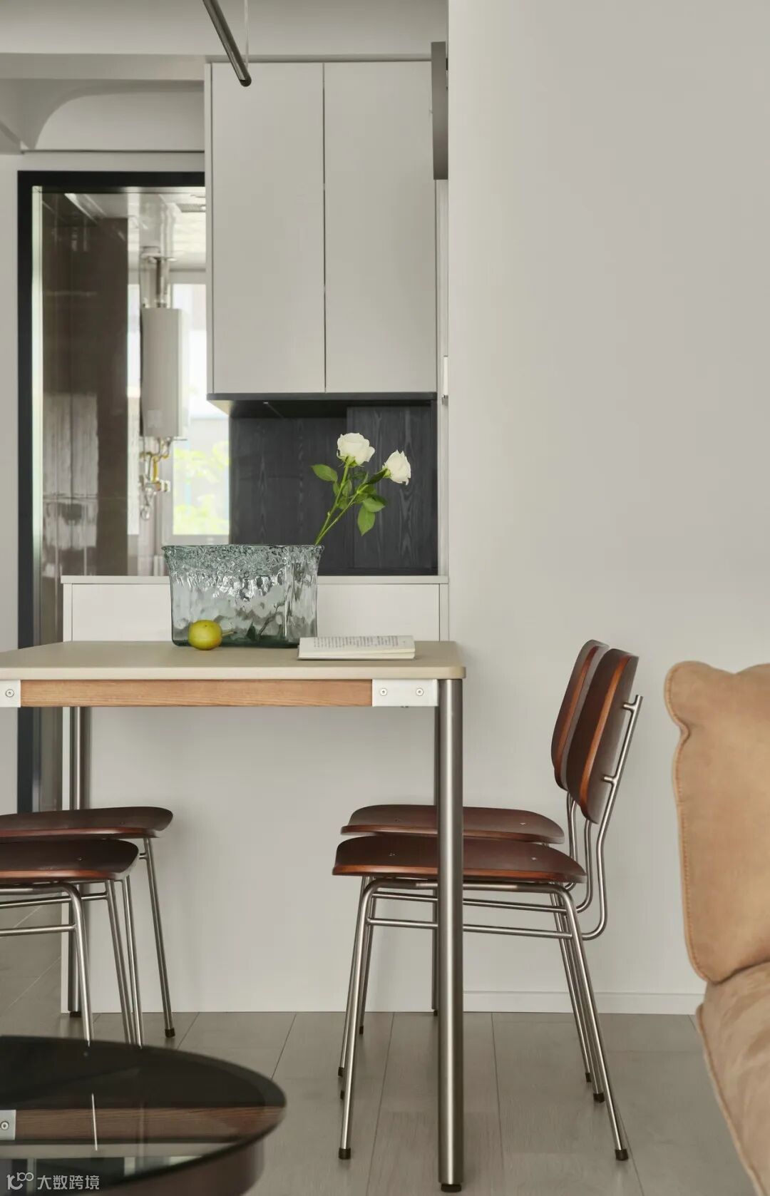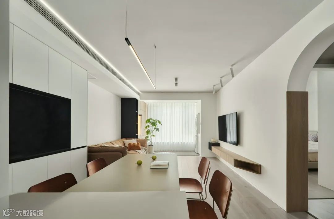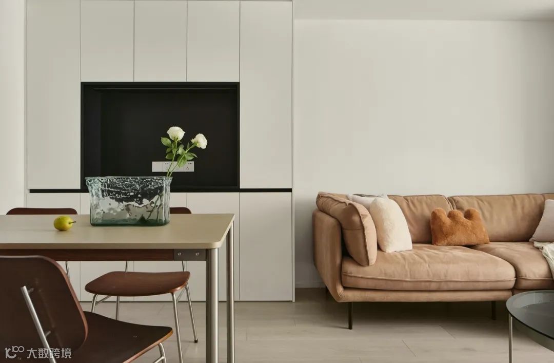 沙发内嵌留出餐厅和餐边柜,沙发左右两边都做了方便拿取的收纳空间。