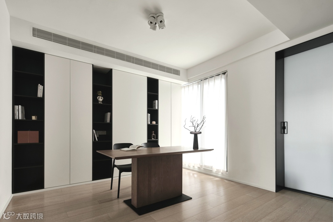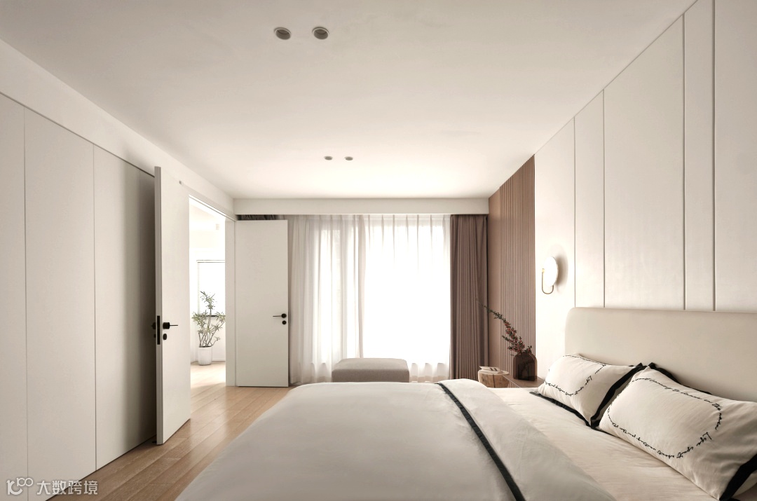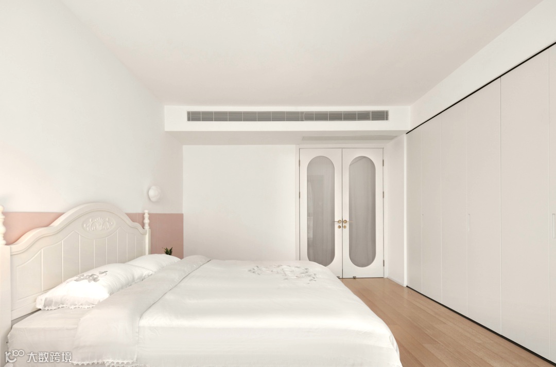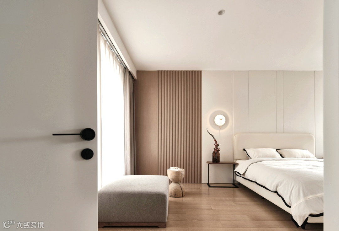 木格栅+硬包装饰主卧床头背景墙,温馨大气。大面积白色延展开来,让整个房间空灵淡然,与木色地板一起勾勒出和谐温馨的氛围。