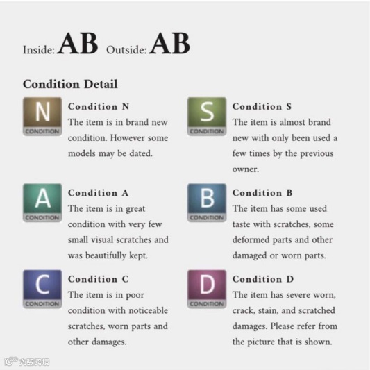 同样的在日本,中古单品交易市场中出售的中古包都会在被鉴定后用字母标注出新旧程度。