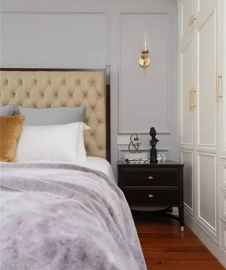 采用软包床头黑色线条勾勒造型,灰调背景色块令空间更具层次感。小巧的床头柜辅以格调摆件,一侧定制整面衣柜满足收纳空间。