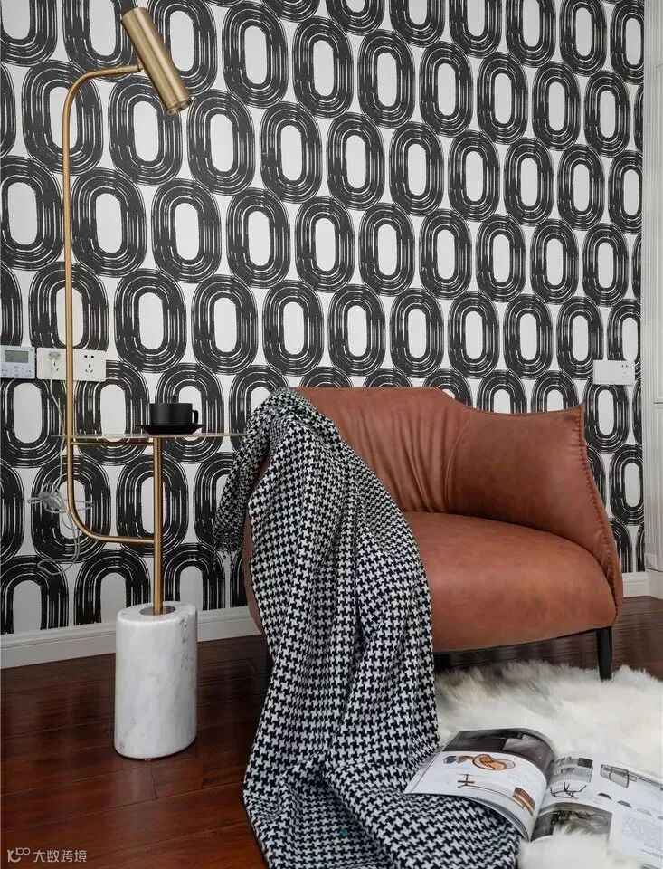 书房铺贴黑白个性墙纸,一体式金属落地灯设计,棕色皮质座椅搭配舒适的毛绒地毯,加上千鸟格毛毯,享受那种临时休憩的滋味。