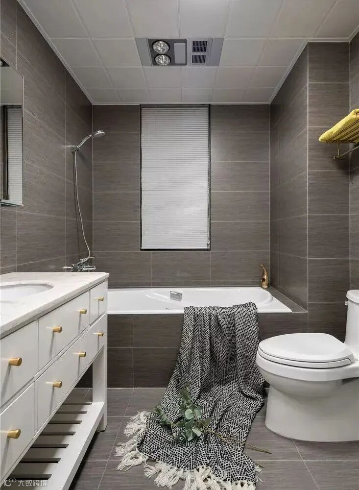主卧卫生间通铺灰色纹理瓷砖,定制纯白色抽屉式浴室柜,下方增设踏板置物,嵌入式浴缸将空间最大化利用,空间虽小却不失精致。奢凡维家,奢享生活,智有不凡。