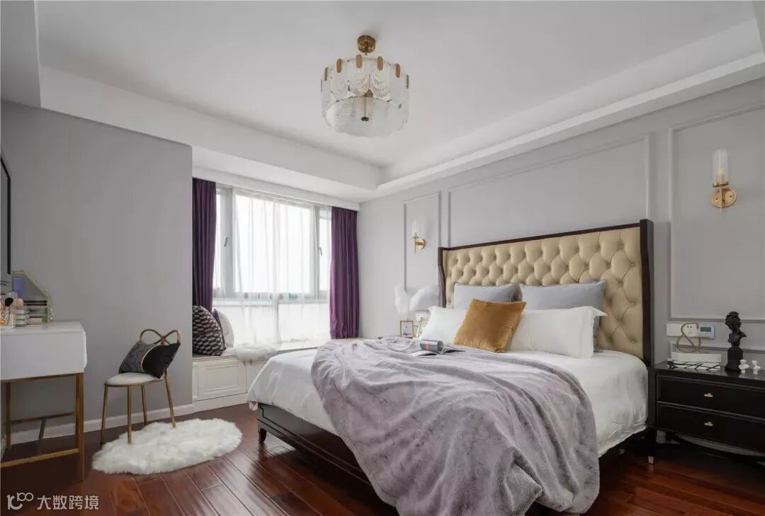 主卧金属元素细节搭配出轻奢格调,休闲惬意的飘窗设计搭配紫色窗帘,营造出别样的优雅氛围。床尾墙角设有梳妆台,简单中不乏舒适感。