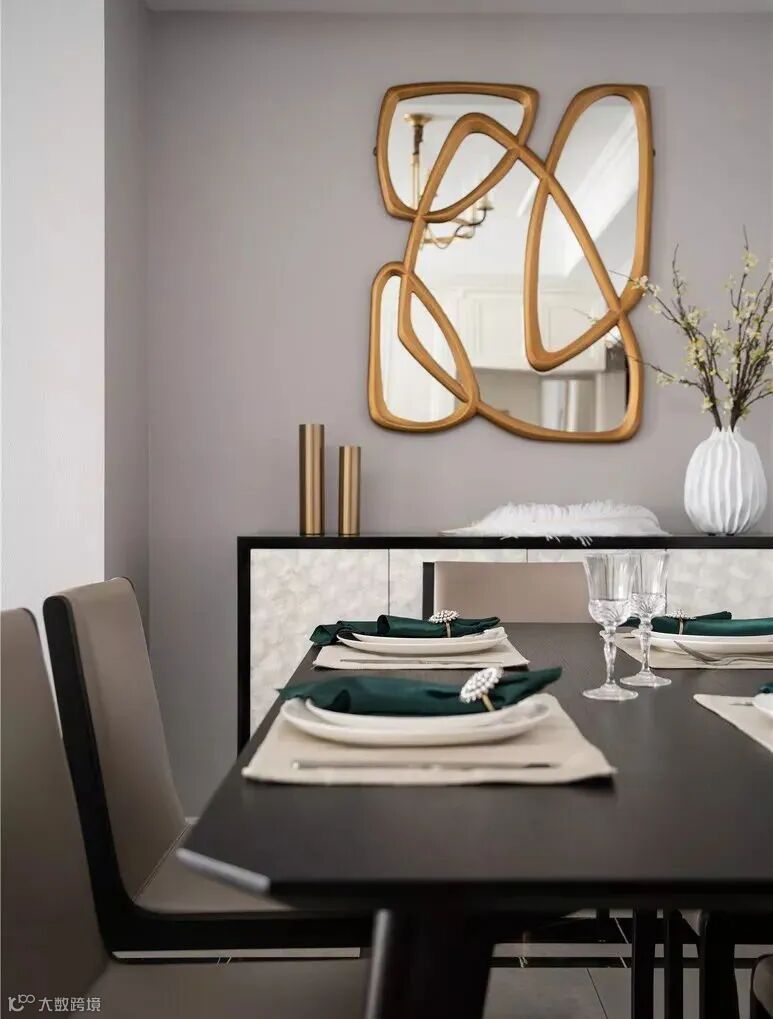 一侧定制白色餐边柜,黑色边框勾勒,墙面独特的镜饰品搭配精致的餐具、唯美的插花加入,带来的是一个情趣浪漫的用餐空间。