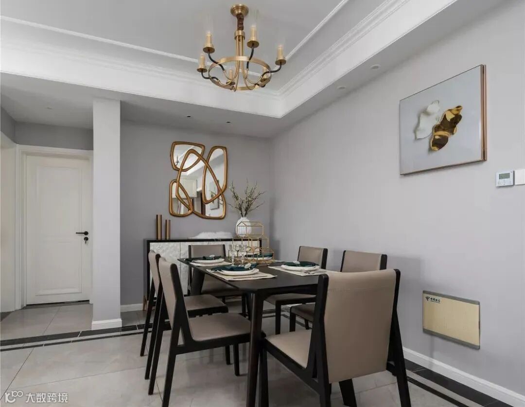 餐厅延续客厅浅灰色饰面背景墙,布置黑色方桌搭配卡其色的餐椅,顶上一盏金属奢雅的吊灯烘托氛围,偏灰色调的装饰画让环境更加宁静。