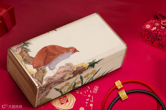 “乾坤吉祥珠”的包装盒华贵不失典雅,锦盒主图以近似于丝绣中品级上等的“缂丝”质感呈现宫廷造办御制缂丝《仙寿安居图》,意在安居乐业,两侧分别以浮雕工艺体现了乾清宫与坤宁宫的立体造型,呼应乾坤吉祥,故宫范十足。