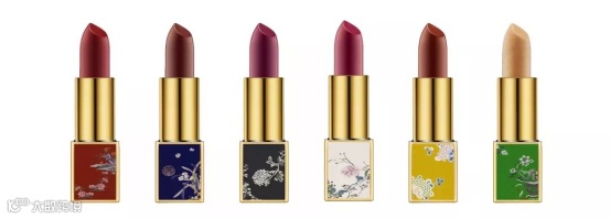 六款颜色分别为:碧玺色、豆沙红、玫紫色、变色人鱼姬、枫叶红、郎窑红。这六只口红的外包装是从后妃服饰与绣品上汲取元素。