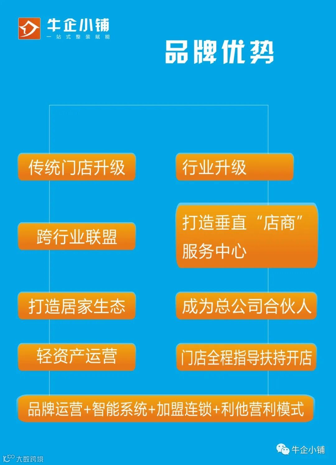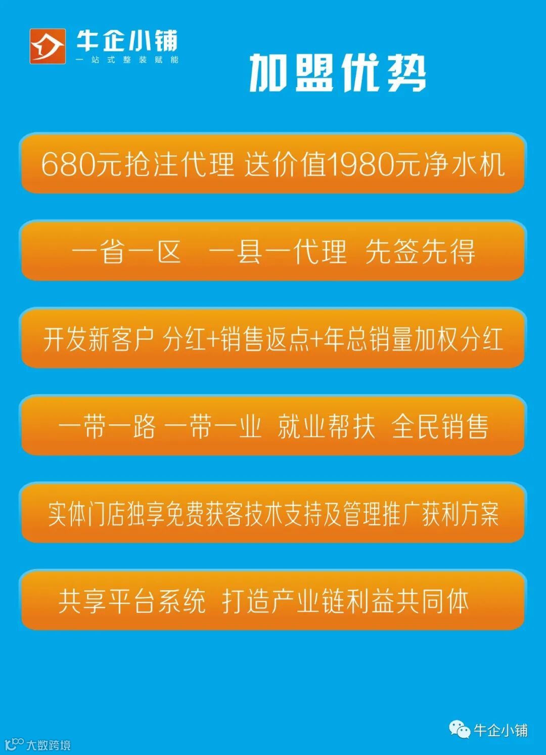 因此当你的同行还在靠产品赚钱时,你就应该让产品不赚钱,让平台为你赚钱。当别人也不让产品赚钱时,你就让他免费。具体操作:共享店铺模式,把门店定义为平台,让竞争对手的员工变成你的合伙人。即共享平台所有产品资源,打造合伙人矩阵团队,每人只需1000元押金,即可成为店铺股东(注意是无底薪合伙制),免费为所有股东合伙人员提供千人千面的分销网店,统一零售价格,利润5:5分成,自购省钱,分销赚钱。年底再拿30%利润作为期权分红,店老板有责任,有义务培训他们如何抖音卖货,如何社群分销。同时依据当地客户需求,打造爆品,解决客户痛点,提出整体解决方案。b,其他模式公司有详解。牛企小铺的价值就是帮助加盟商打造项目,设计融资与卖货模式,把加盟商周边人脉资源打造成人脉银行,让未来的收益提前变现。