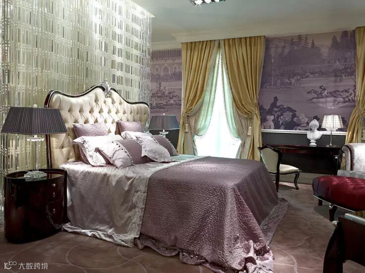 古堡里有舒适的欧式大床,紫色的贵妃椅,精致的餐具在透进窗的阳光的折射下,散发着光芒,沉静、悠扬。