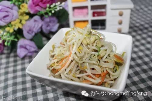 做法:1)用剪子把豆芽菜的根剪掉,然后在清水里洗一下,把绿豆壳洗掉2)准备一锅热水,把豆芽菜倒进去焯一下3)焯到水沸腾后取出;再把切好的胡萝卜丝放进去焯一下;取出与豆芽菜一起沥干水份4)把豆芽菜、胡萝卜、香葱放进碗里;加入适量的生抽;再加点醋;拌一下即可食用啦