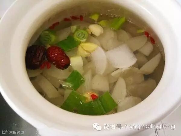 砂锅里放入白萝卜块、大枣、枸杞、去壳的桂圆、生姜、大葱、大蒜瓣,加入足量水,烧开;