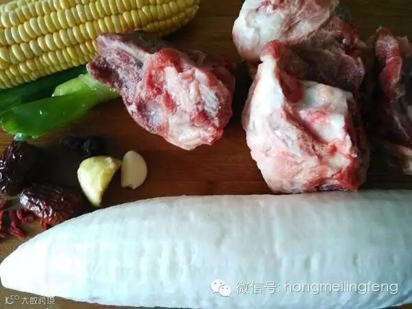 棒子骨1kg,白萝卜两个,玉米1根,大枣2颗,桂圆2个,枸杞适量,姜蒜葱适量。