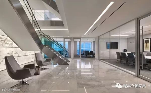 灰色白色调子为主的现代简约风办公室。地面以灰白色天然石材做铺装,局部墙面采用同类石材做装饰。