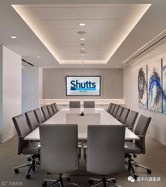 会议室地面铺装采用灰色地毯,白色石材台面会议桌与灰色会议椅,墙面装饰使用了蓝、灰色搭配的抽象画。