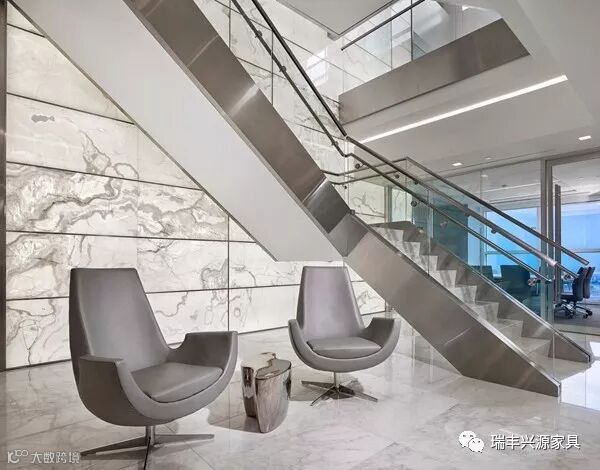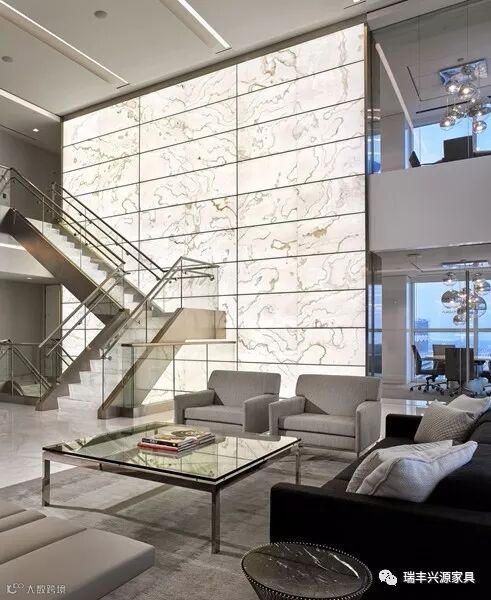 巨大的石材纹理背景墙与现代扶梯映衬,旁边的休闲区沙发是灰、黑两色主导的配色,金属框架茶几,台面使用钢化玻璃和石材。整个区域简洁有力。