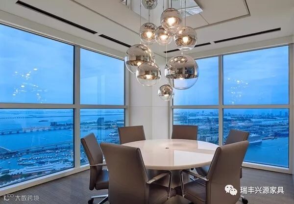 小会议室,使用了石材台面的圆形会议桌。大会议室同款会议椅。多个银色球体的吊灯设计是小会议室的空间亮点。