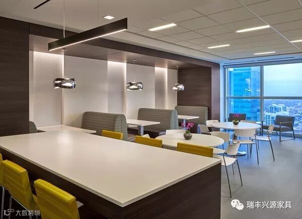 餐区部分,大部分家具使用灰色卡座沙发与白色简约风桌椅搭配,白色吧台区与黄色吧凳搭配。有了亮色点缀。