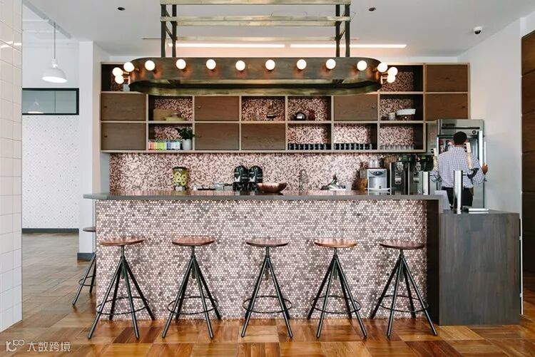 吧台餐区,复古酒吧风格明显,大地色马赛克,铁艺吧台凳,复古吊灯。