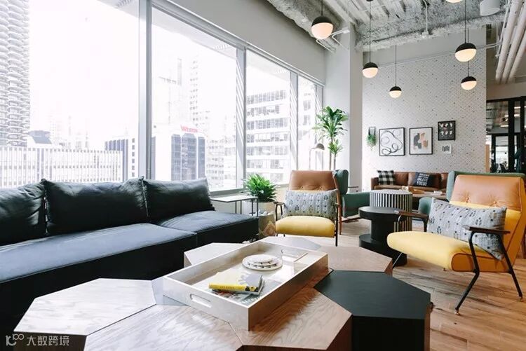 休息区基础款黑色沙发,复古的铁腿沙发采用颜色对比配置,黑色和黄色搭配活泼温馨。墙面装饰画颜色匹配。绿植装饰。茶几采用六角小木墩拼接摆放,原木色中使用一个黑色的颜色跳跃配置。,休息区浑然一体。
