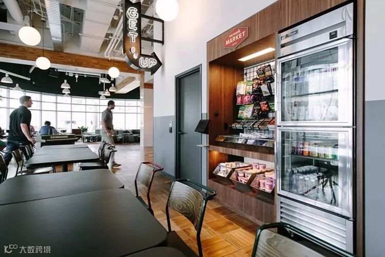 零食区,饮料柜均被嵌入了墙体内的使用了木饰面做了装饰。简直是便利店的一角。零食区的桌椅也是工业风深色的小桌椅。