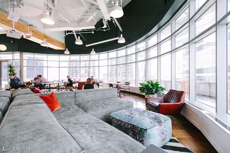 另一边靠窗休息区。白色窗框与白色天花呼应,配以灰色沙发,红色单件沙发、靠包跳跃配置。