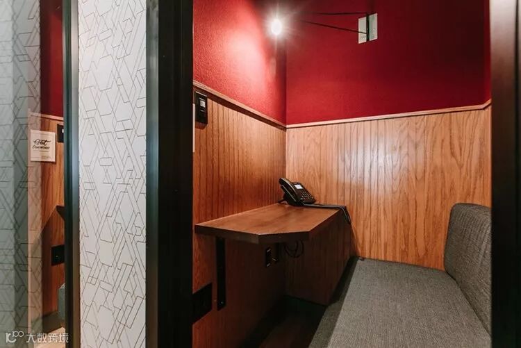 单独的小办公间是专门为单人专注工作,接打电话而准备的,值得既简单是,吸音材料和墙裙木饰面结合设计,非常有质感。桌子直接固定于墙面,且靠门边桌角切掉处理。方便进出。不卡顿。灰色双人卡座。店员安排妥当。