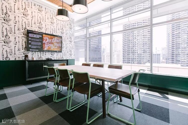整个会议室硬装方面花心思做了设计和搭配。家具方面的造价是很低的。均为饰面的基础款。绿色铁艺椅配原木长条桌。墨绿墙裙裙板,地毯墨绿与白色复古拼接搭配,电视背景墙使用了手绘风格强烈的个性的乐器壁纸。
