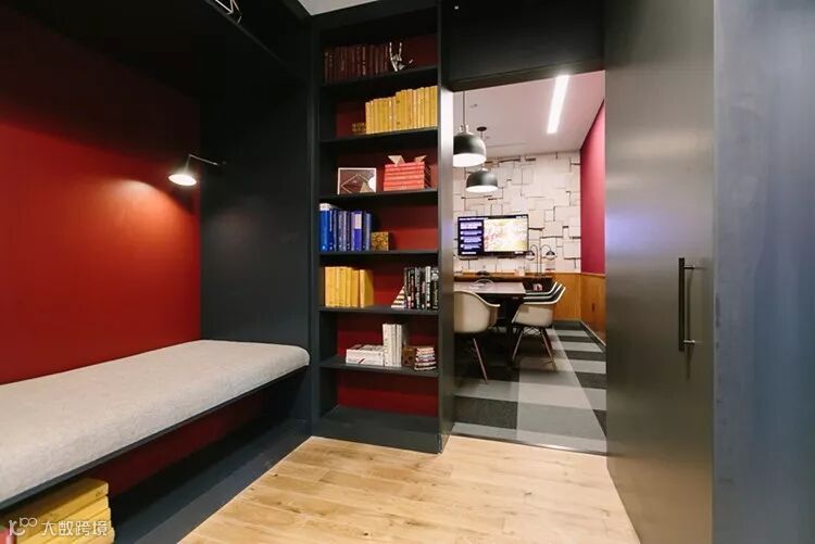 会议室门口、走廊使用了深灰、红色配色定制书柜,背景墙。复古味道浓厚。会议室使用了伊姆斯椅。