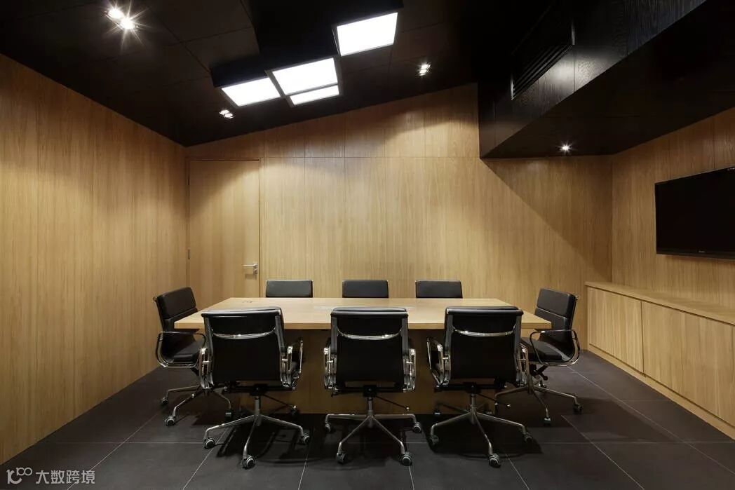 白色基础款会议桌。黑色网椅。这个空间的硬装就厉害了。欧式木饰面与深灰半面墙壁搭配。古典现代相互穿越。