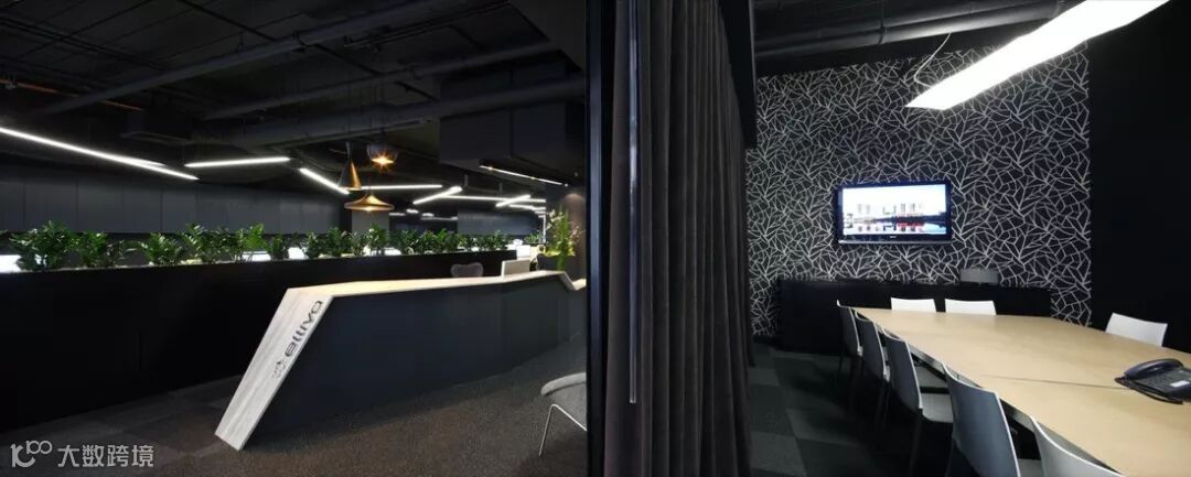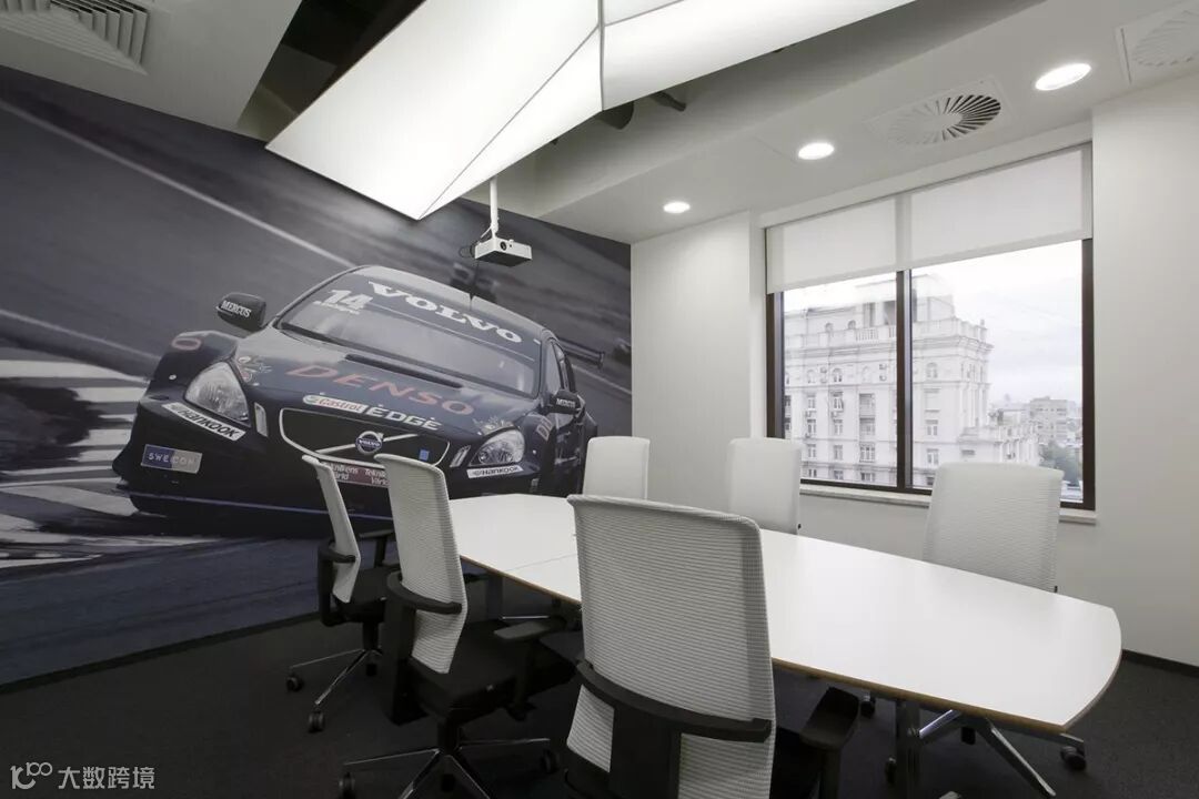 基础款流线会议桌,黑白配一面墙汽车的壁纸。凸显行业酷炫感。