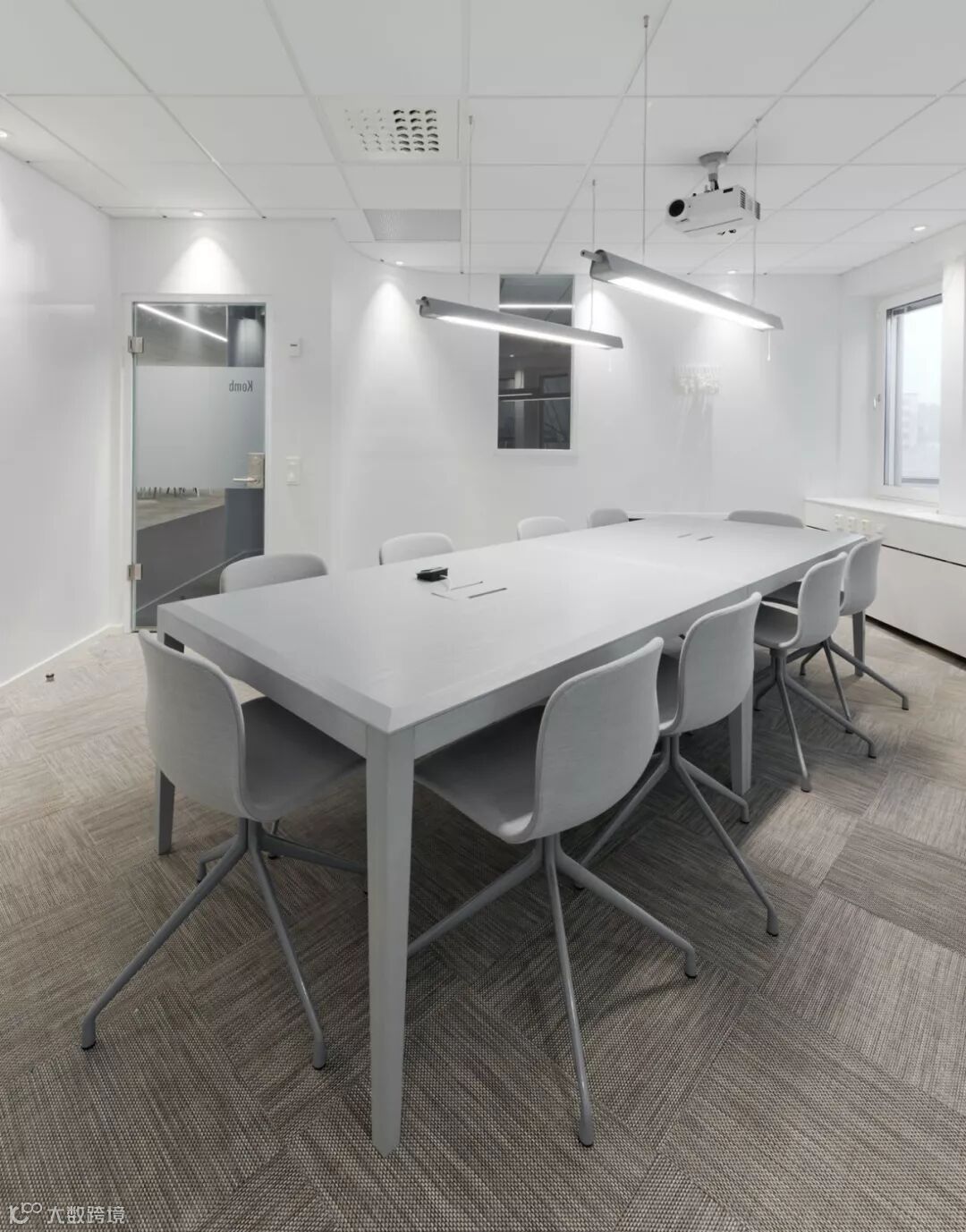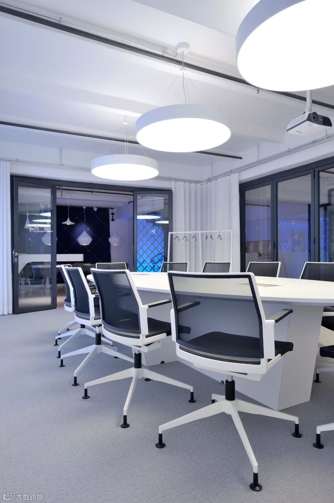 白色会议室。。局部蓝色灯光映衬,几个圆盘吊灯装饰会议区。视觉统一的非常和谐。