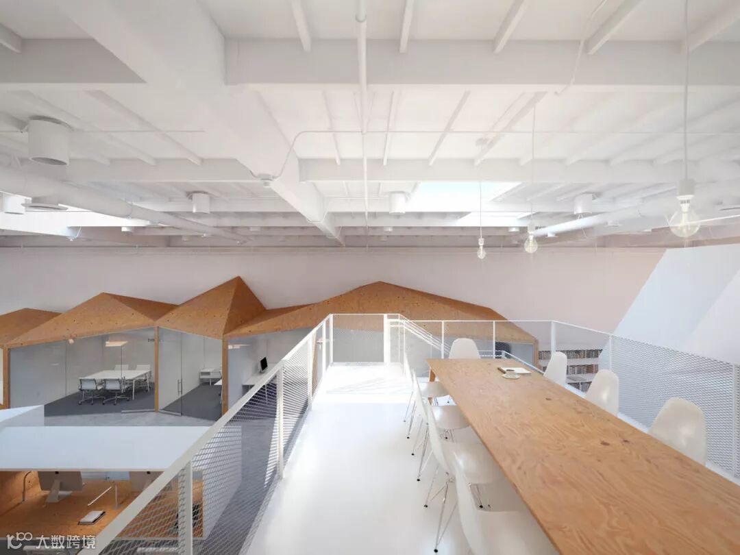 空间局促的地方使用圆桌做会议桌。橙色ABS材质椅子。现代简洁风。木饰面天花板动感十足。