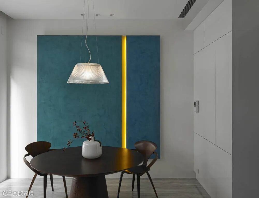 大幅单色装饰画透出黄色灯光。搭配小空间圆形胡桃木桌椅。复古玻璃吊灯,花艺,整个画面宁静,雅致。
