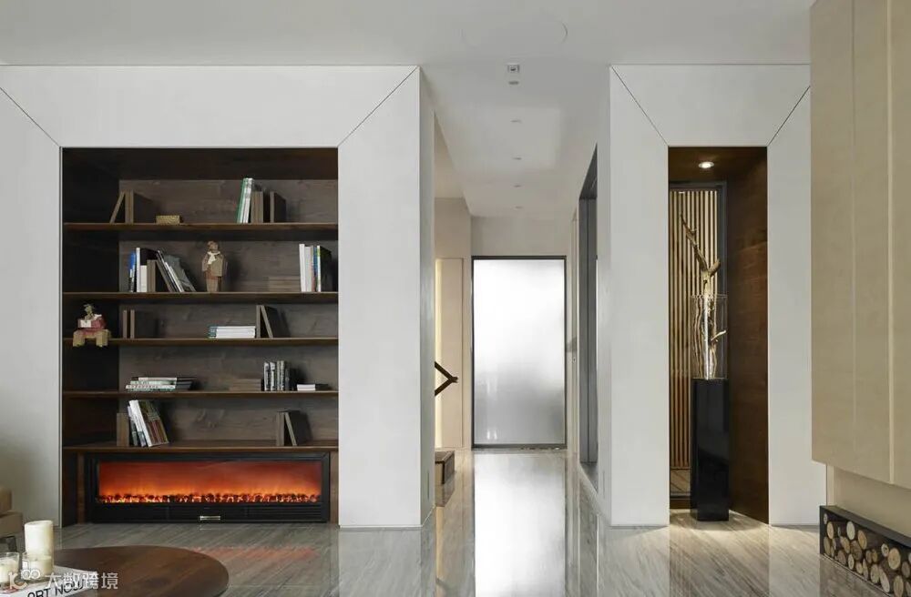 白色墙面凹陷做出胡桃木书架,最下层放置了暖炉装置。旁边墙壁有透景的设计,让房间之间采光得到一定改善。