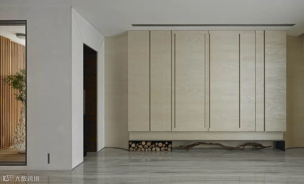 另一组储物柜使用了浅木色门板边缘抠槽样式设计。整个柜体放置在深色钢板置物架上。钢板内部隔出放置木柴与长木摆件两部分。这样的设计,让这组柜子更富有禅意了。柜体与旁边墙面的木饰面采用弧形木饰面过度链接。