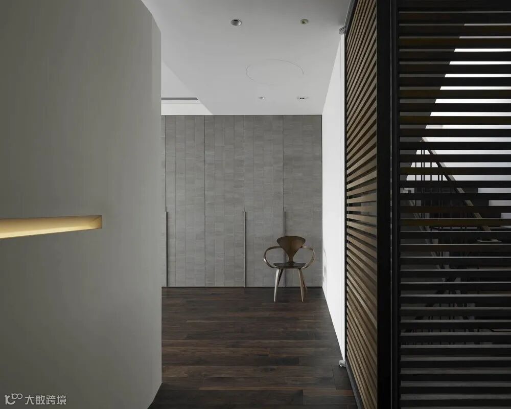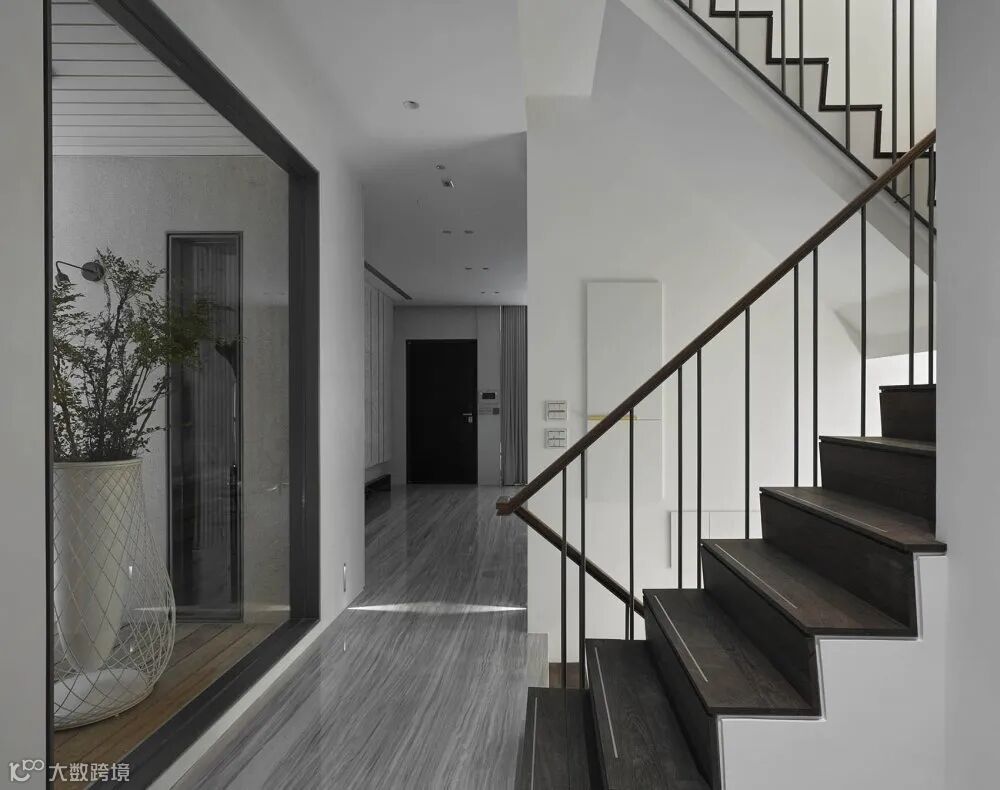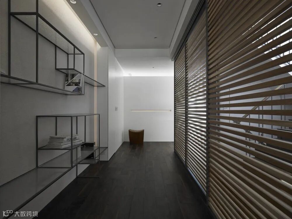 铁艺置物架给将来储物预备了足够空间。透景设计的格栅木饰面。用来遮掩部分楼体的设计。视觉上让这条长廊更加整齐。