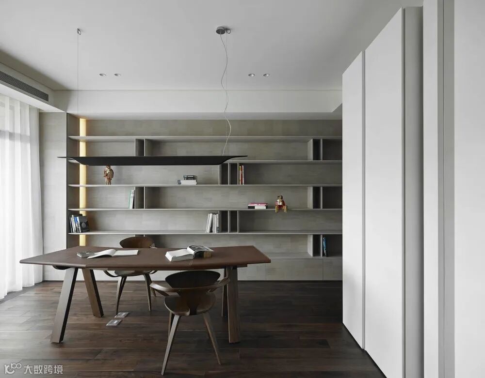 米灰色墙面置物架,轻巧对称。深色地板上同色系的弧形书桌椅摆放。直线布满的空间里,有了动感的曲线。