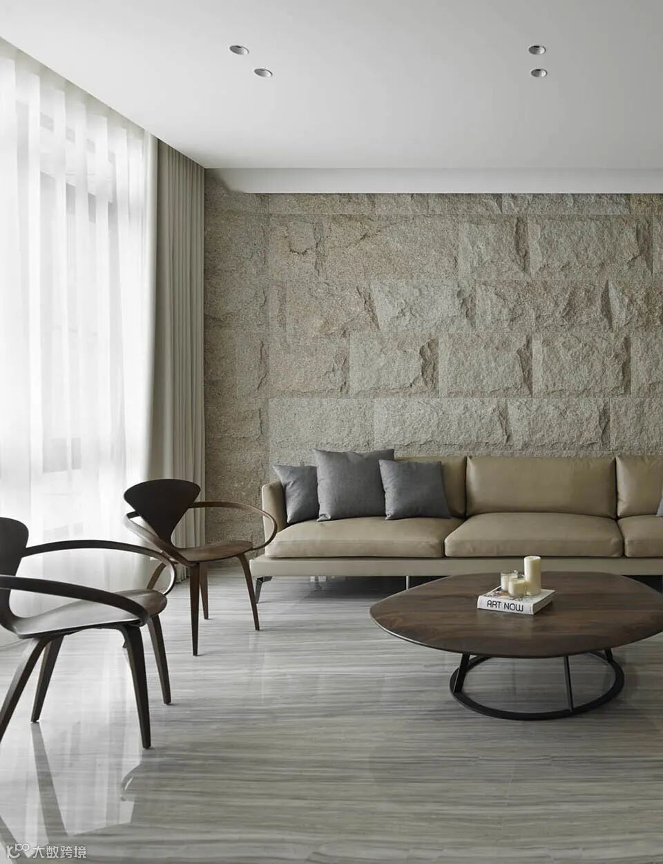 客厅区,石块风格粗犷墙面作为沙发背景墙。卡其色简约皮质沙发搭配的黑胡桃流线造型茶几、休闲椅。方形圆形在形状上对应,肌理从粗到细。