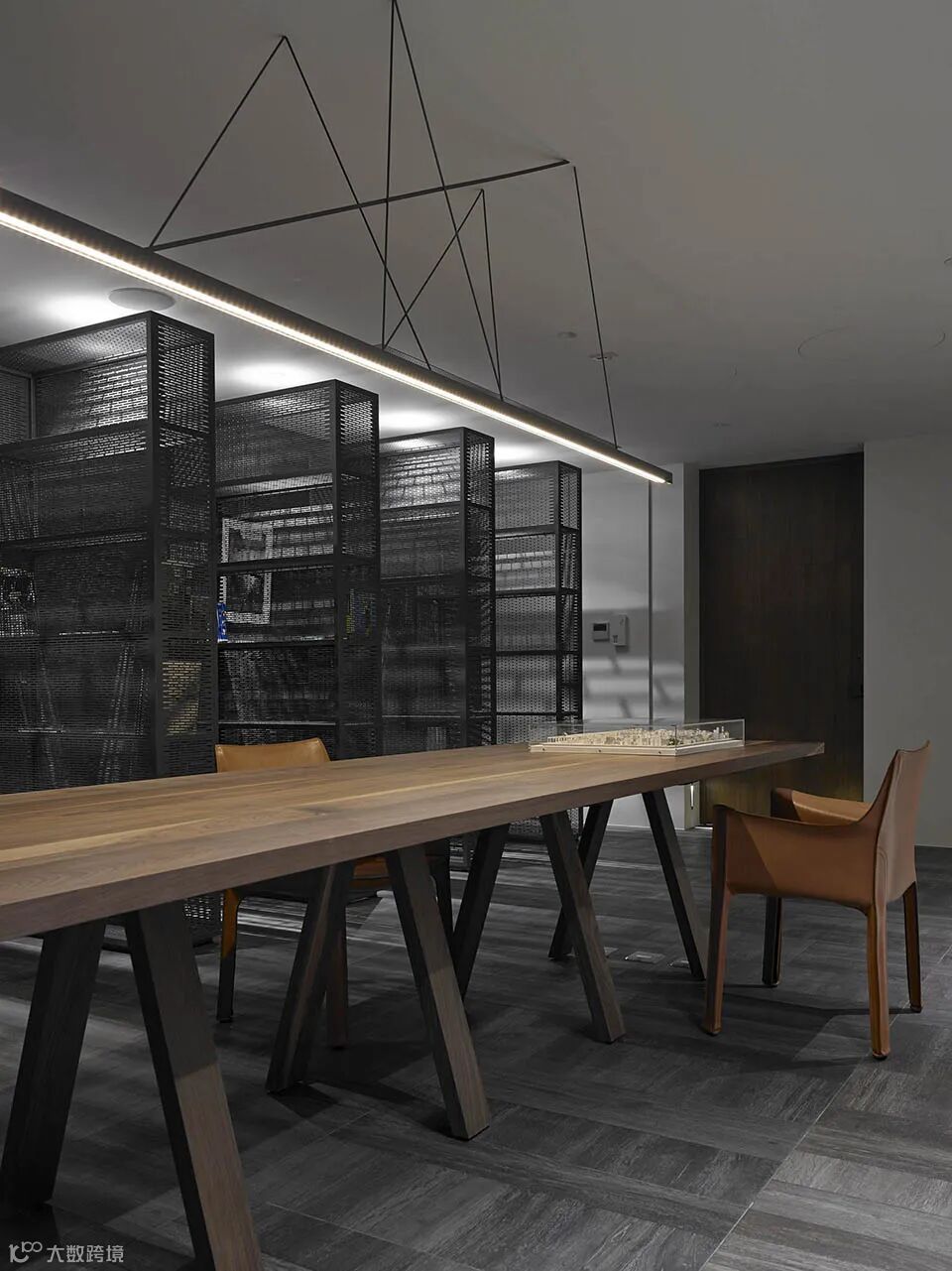 黑色铁丝网打造的成列储物柜对应长条木桌,橙色阅读椅。条形LED灯的吊线做了数条几何造型交织。空间极具动感